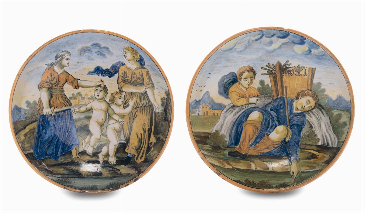 Coppia di piattini in maiolica decorati con figure e dorature, Castelli XVIII secolo