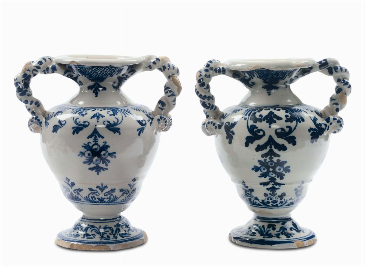 Coppia di vasi biansati con decoro alla Berain, Savona XVIII secolo