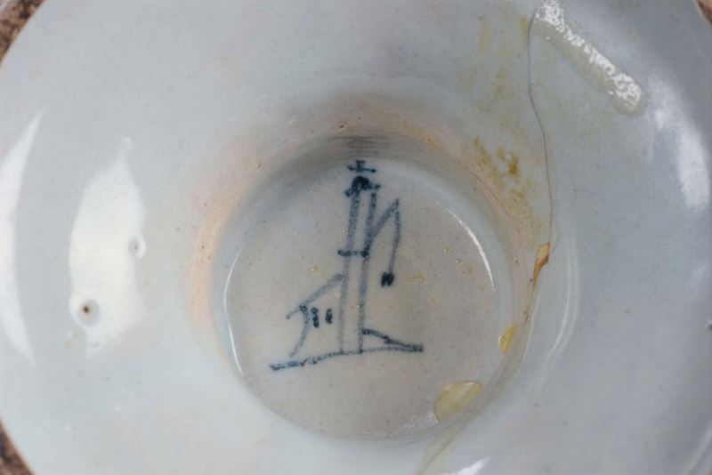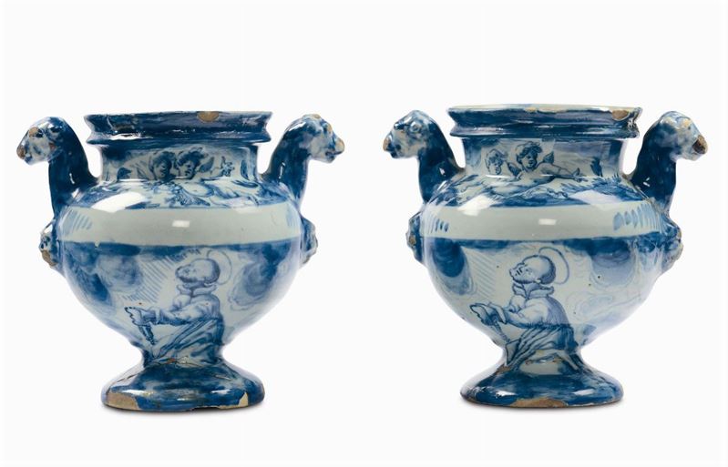 vaso di forma ovoidale su piede circolare con anse a protomi leonine, decorazione in monocromia turchina con Santo inginocchiato e putti, cartiglio anepigrafico, marca Lanterna, altezza cm 20 (restauri e rotture)