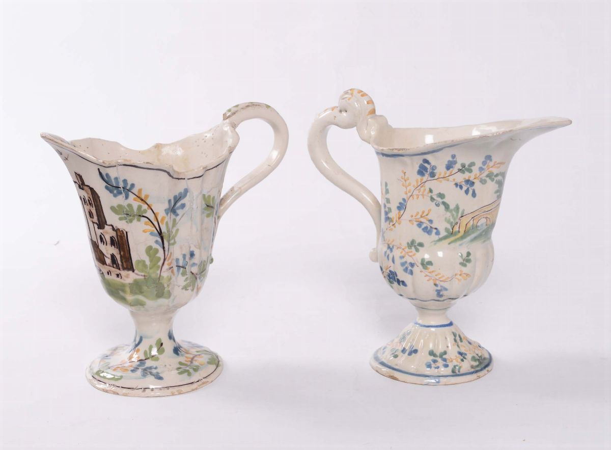 Due brocche a elmo in maiolica, Pavia XVIII secolo