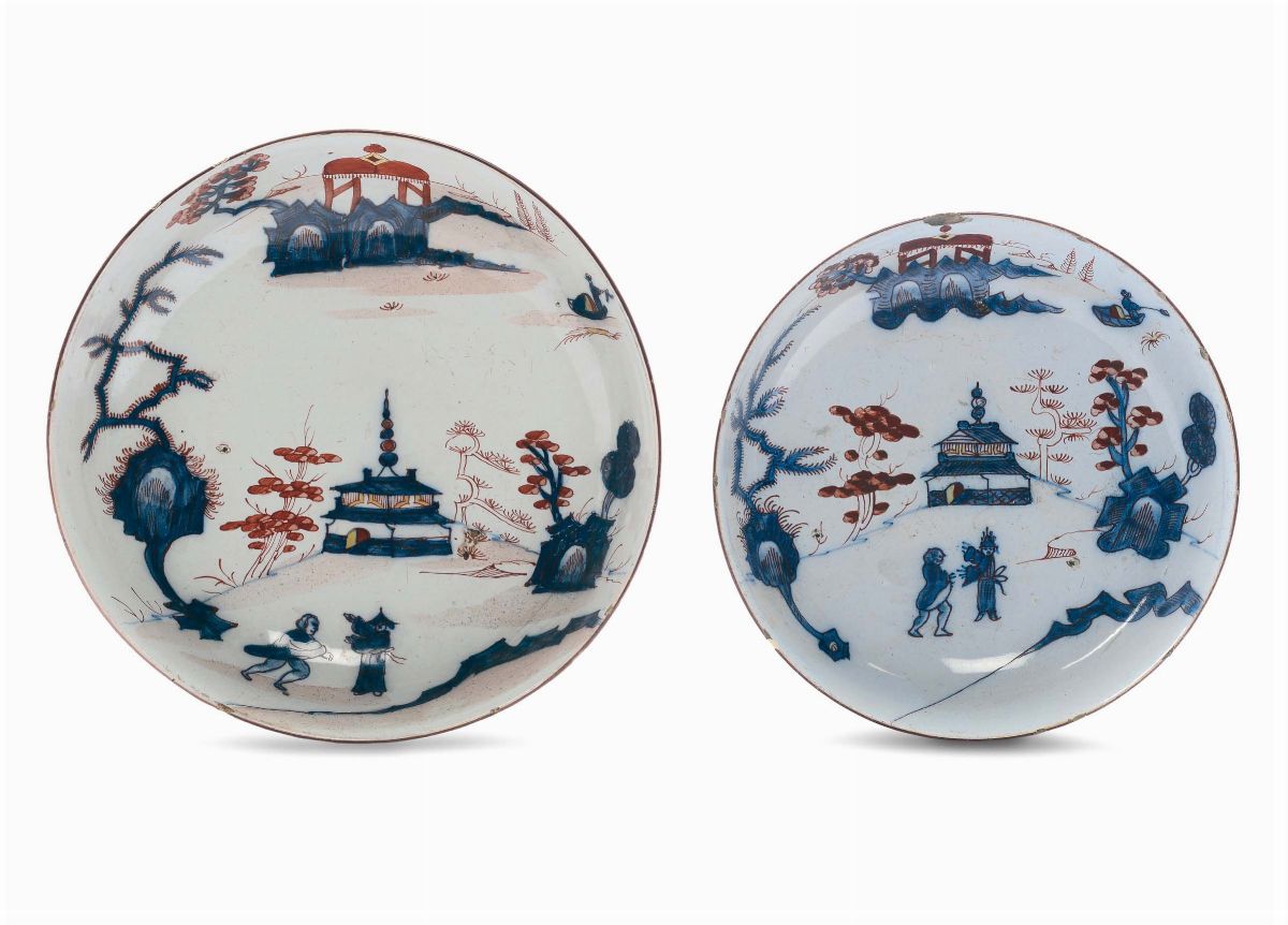 Due ciotole in maiolica con decoro a carabiniere, Milano XVIII secolo