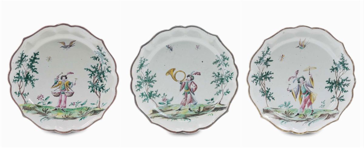 Insieme di tre piatti in maiolica con figure orientali e cacciatore, Felice Clerici, Milano XVIII secolo