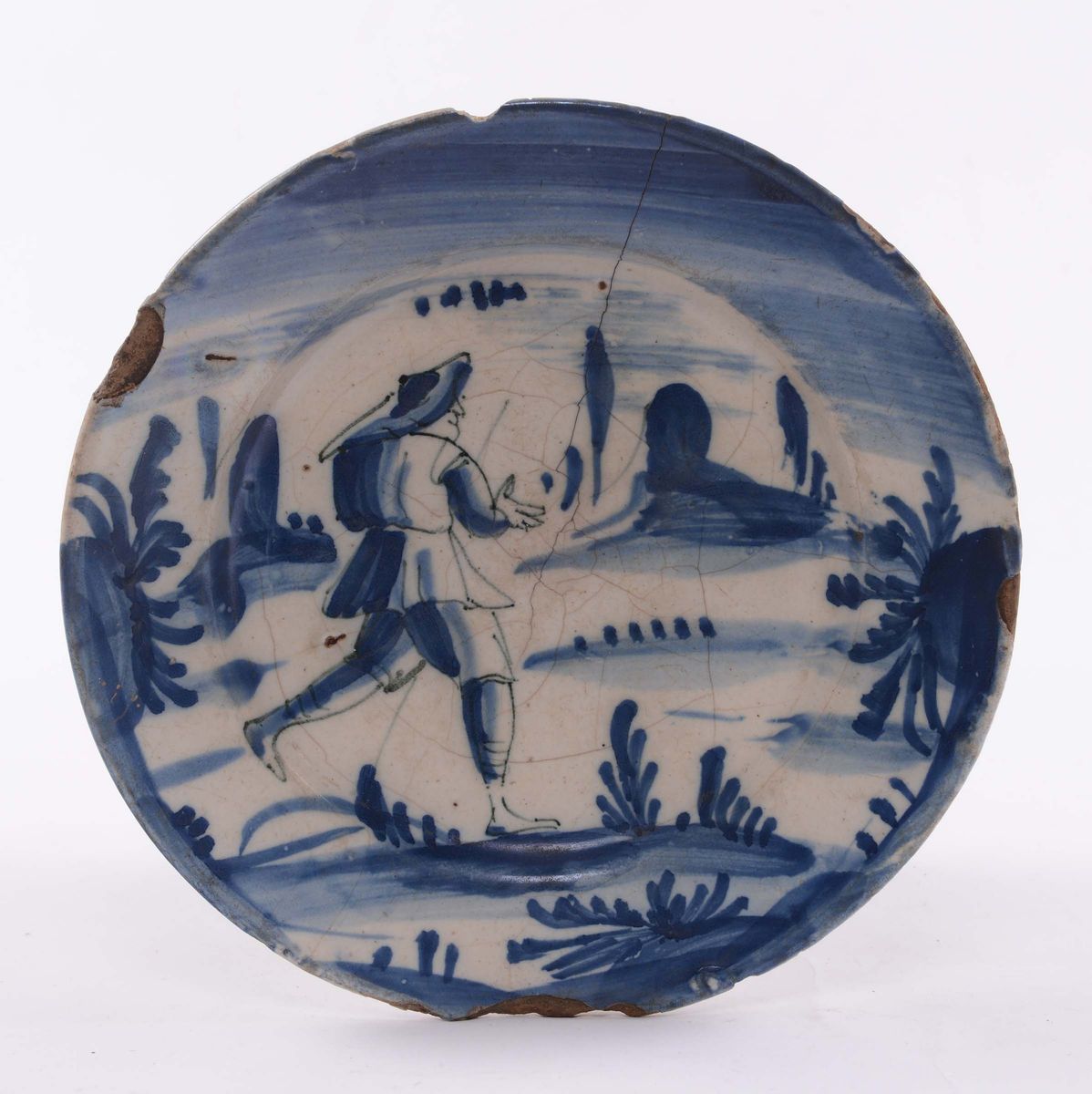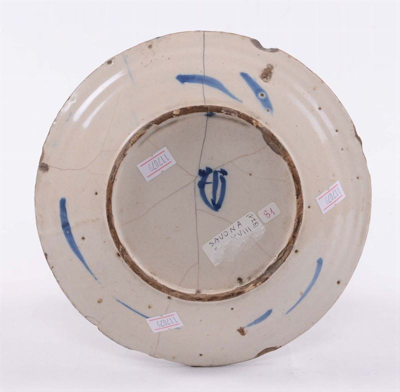 Piattino in maiolica con decoro a scenografia barocca, Savona XVIII secolo