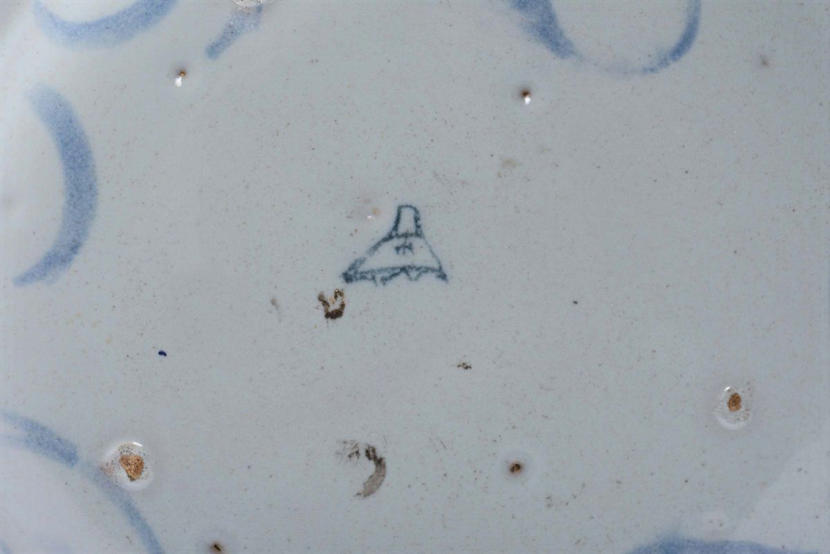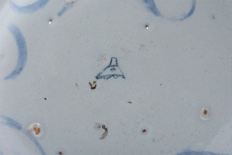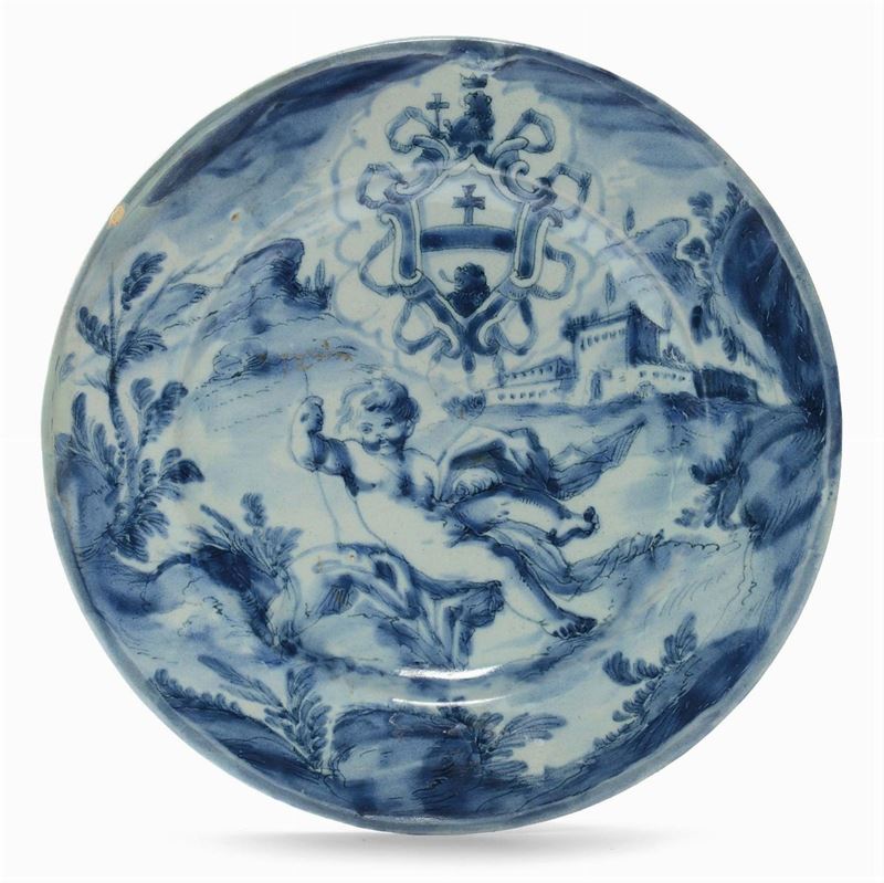 decoro raffigurante putto seduto entro paesaggio e stemma, marca Stemma di Savona, diametro cm 22,5 (difetti)