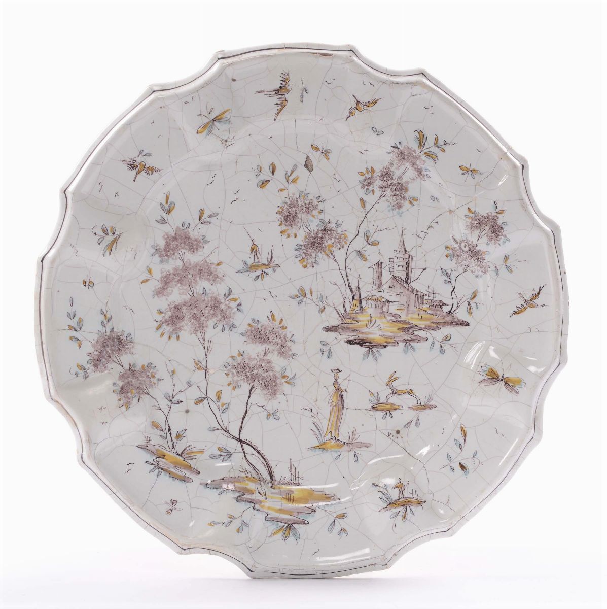 Piatto in maiolica decoro in manganese a figurette e rovine, Faenza XVIII secolo (?)