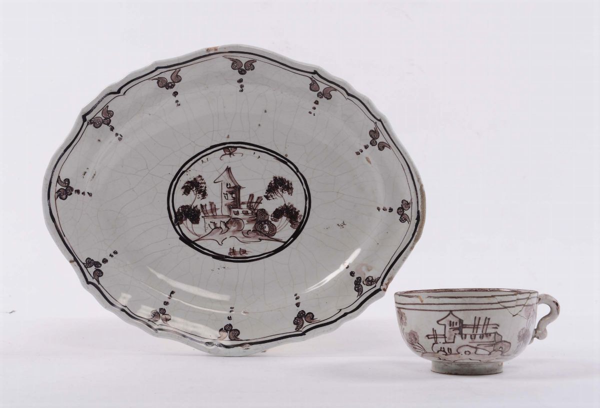 Piatto sagomato e tazzina in maiolica, XVIII secolo