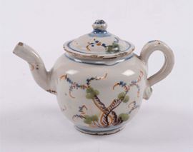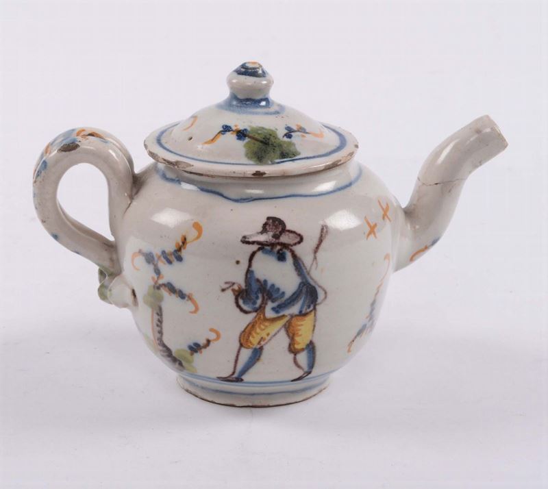 Piccola teiera in maiolica a decoro policromo, XVIII secolo