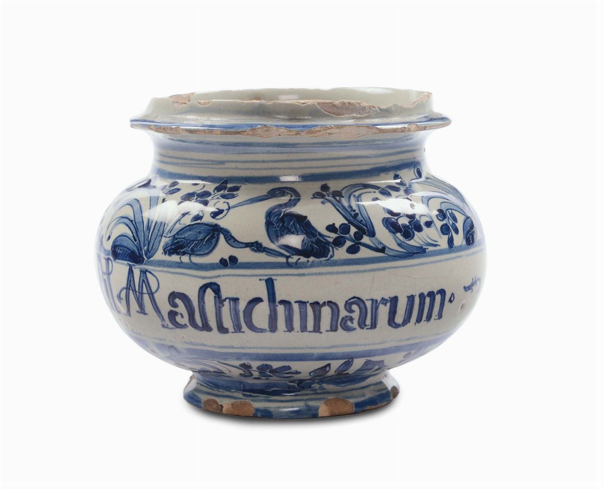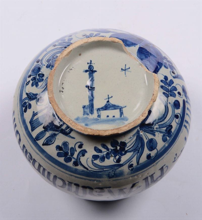 Pilloliere in maiolica a decoro calligrafico naturalistico, Albisola XVII secolo