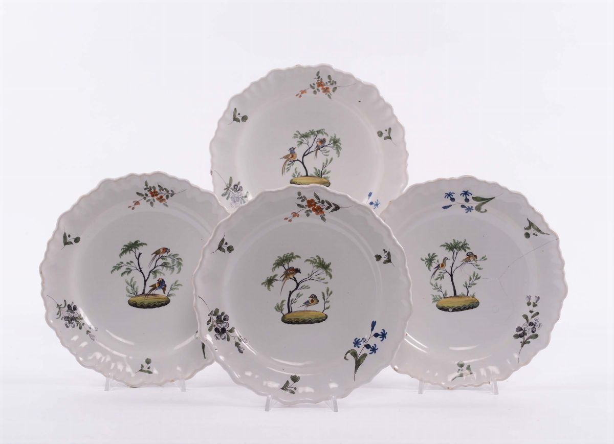Quattro piatti in maiolica decorati con uccellini, Francia XIX secolo