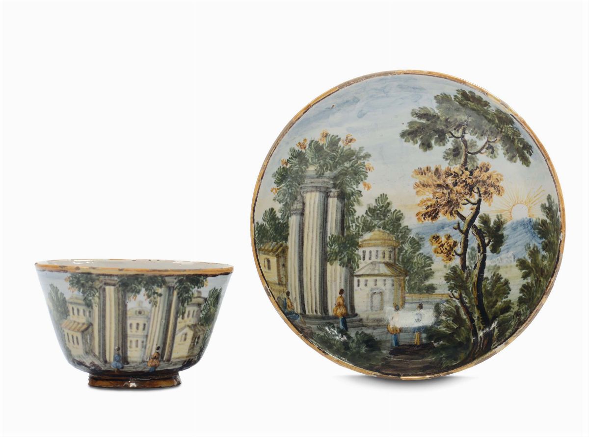 Tazzina e piattino decorati in policromia, Castelli XVIII secolo