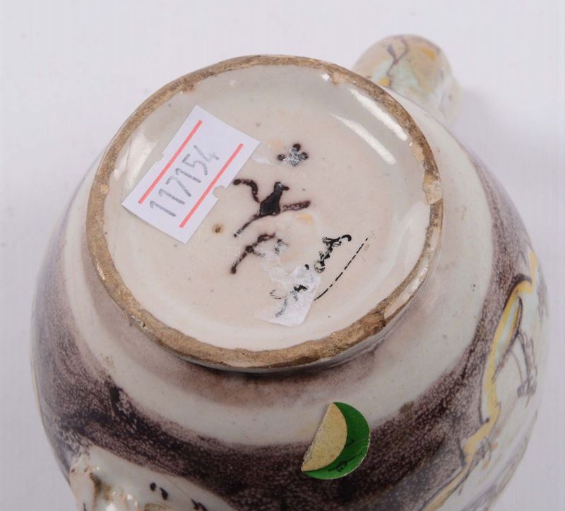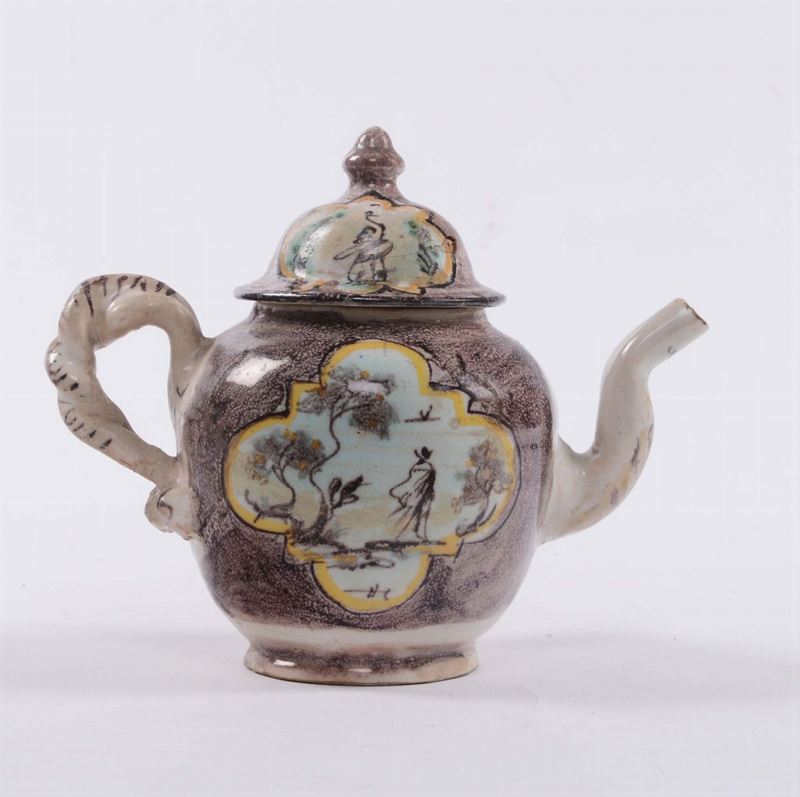 decoro con riserve sagomate racchiudenti ciascuna un paesaggio con figurine a animali, fondo uniforme in manganese, altezza cm 13 (restauri)