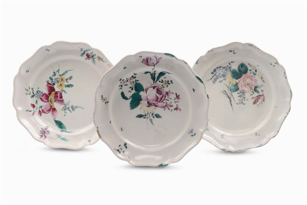 Tre piatti in maiolica con decoro alla rosa, Jacques Boselly, Savona XVIII secolo