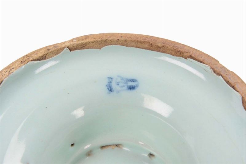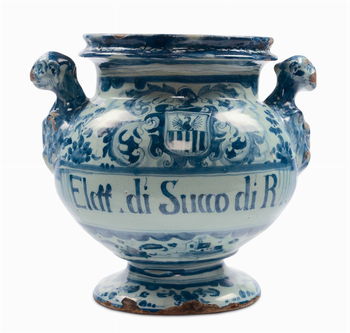 Vaso da elettuari in maiolica con decorazione “a tappezzeria” con stemma, Savona XVII secolo