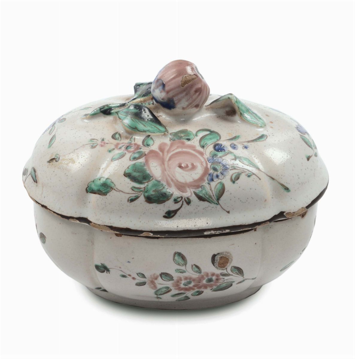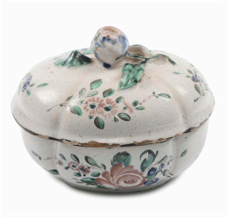 Zuccheriera in maiolica con decoro alla rosa, Pesaro o Faenza XVIII secolo