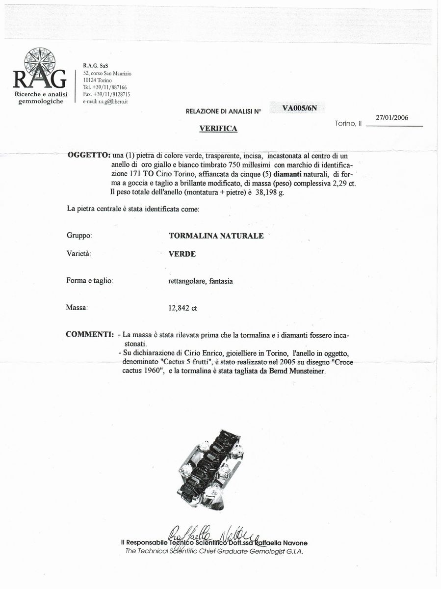 Enrico Cirio, Torino 2005. Cactus 5 frutti anello con tormalina verde di ct 12,842 e 5 diamanti taglio a goccia per ct 2, [..]