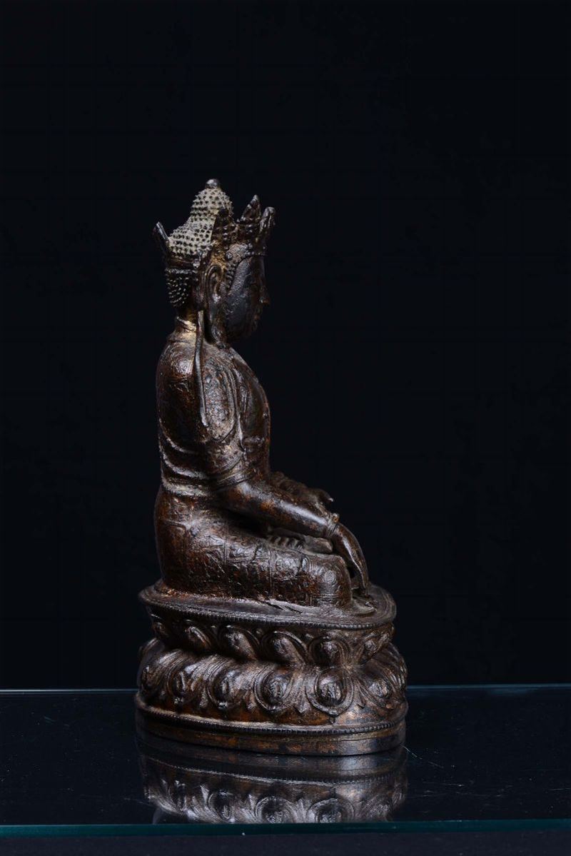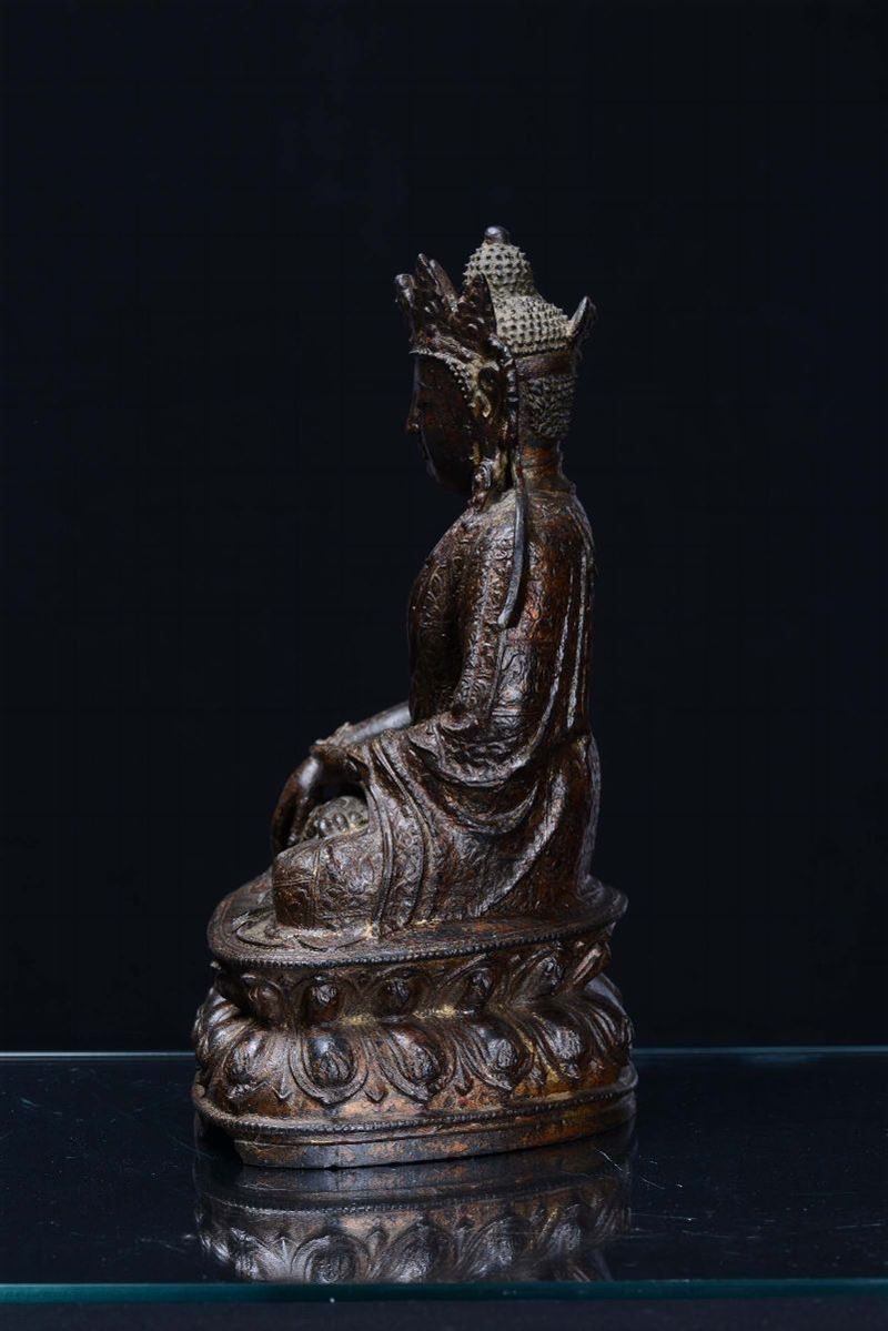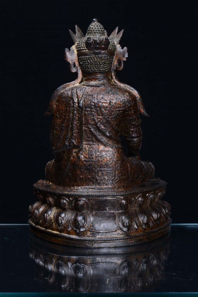 Buddha in bronzo a patina scura con lumeggiature in oro, Cina, Dinastia Ming, XVII secolo