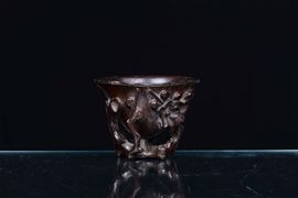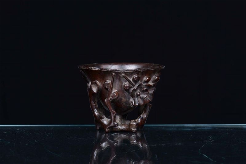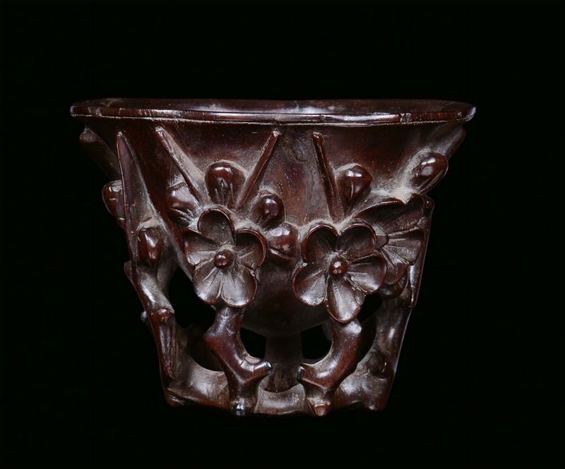 Coppa da libagione in legno scolpito e traforato a motivo floreale, Cina, Dinastia Qing, XVIII secolo