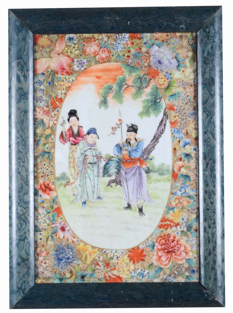 Coppia di placche in porcellana dipinta a mille flor a riserve con figure orientali, Cina Repubblica, XX secolo