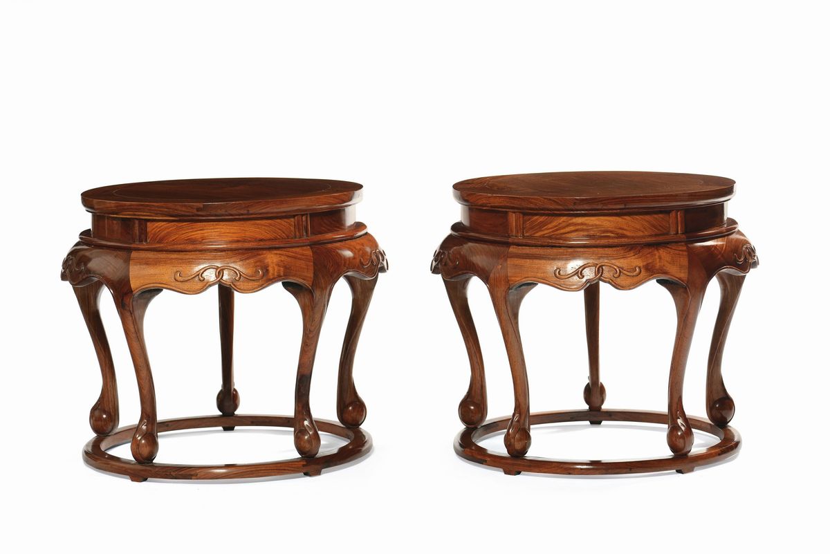 Coppia di sgabellii intagliati in legno Huanghuali, Cina, XX secolo