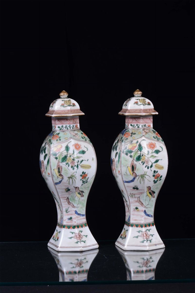 Coppia di vasetti in porcellana policroma con coperchio, Cina, XIX secolo