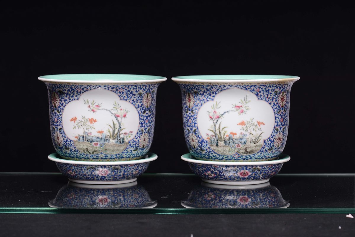 Coppia di vasi con sottovasi in porcellana finemente decorata nelle riserve con raffigurazioni naturalistiche Cina, Repubblica, [..]