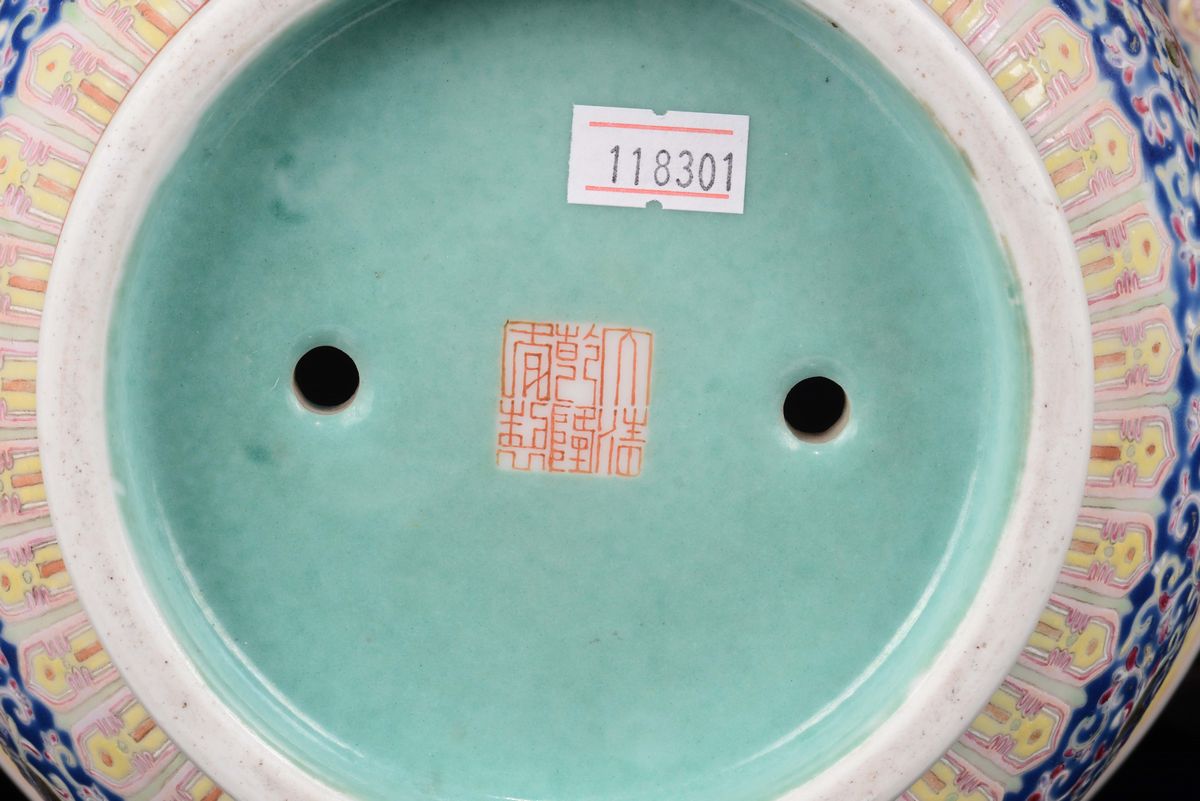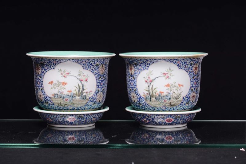 Coppia di vasi con sottovasi in porcellana finemente decorata nelle riserve con raffigurazioni naturalistiche Cina, Repubblica, XX secolo
