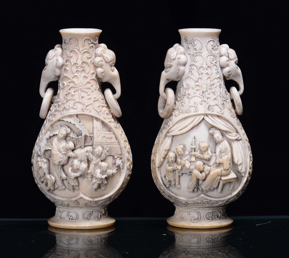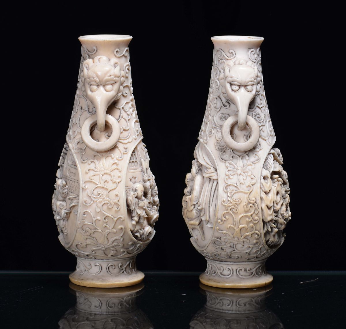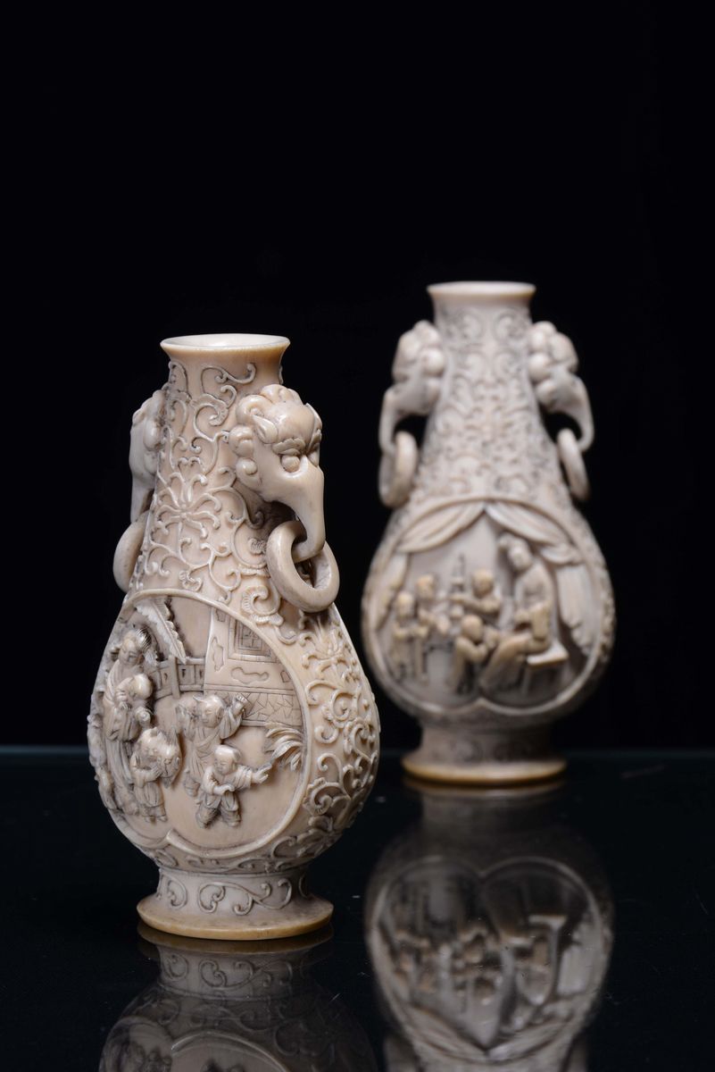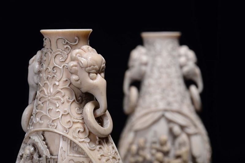 Coppia di vasi in avorio con anse ad elefante e decoro con figure finemente scolpite, Cina, Dinastia Qing