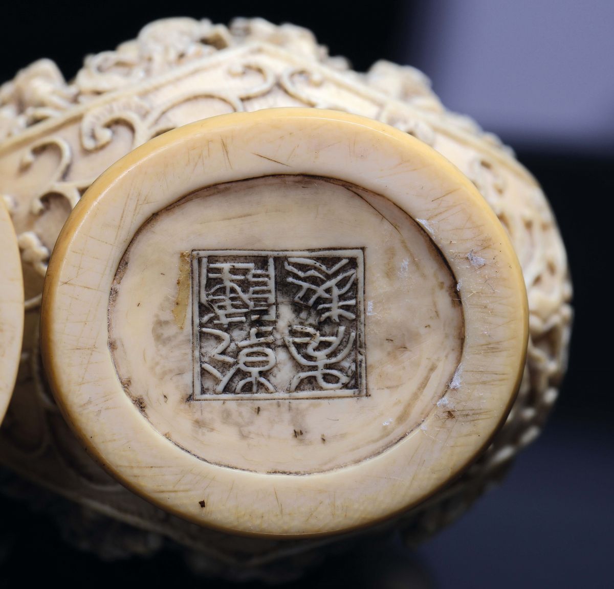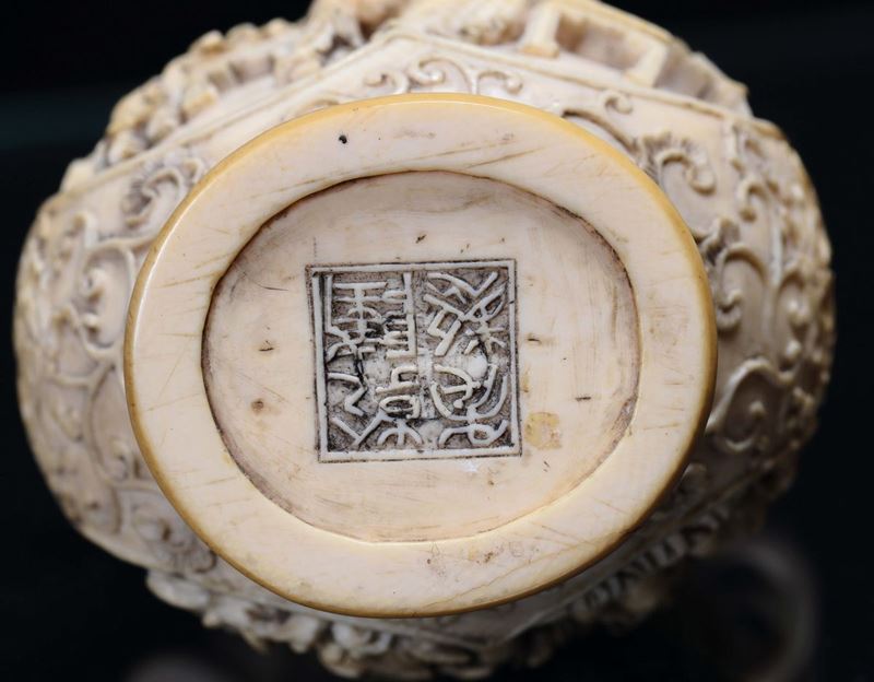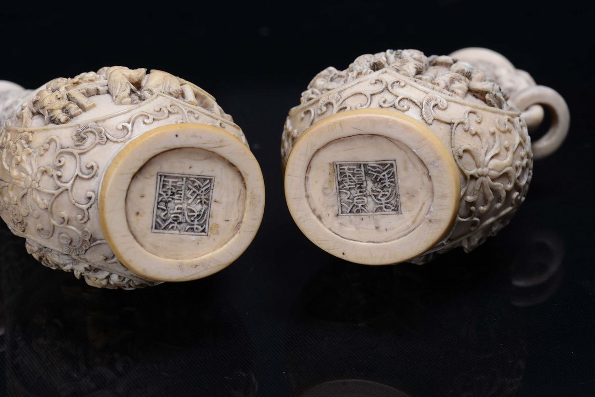 Coppia di vasi in avorio con anse ad elefante e decoro con figure finemente scolpite, Cina, Dinastia Qing