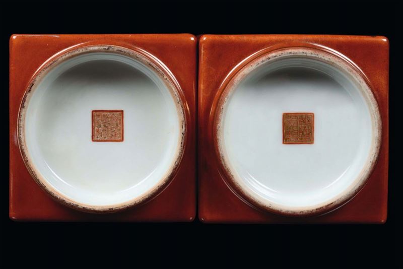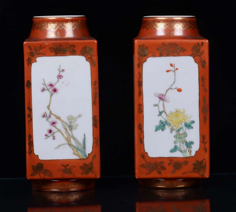 Coppia di vasi in porcellana decorati in policromia nei colori della Famiglia Rosa, Cina, Repubblica XX secolo