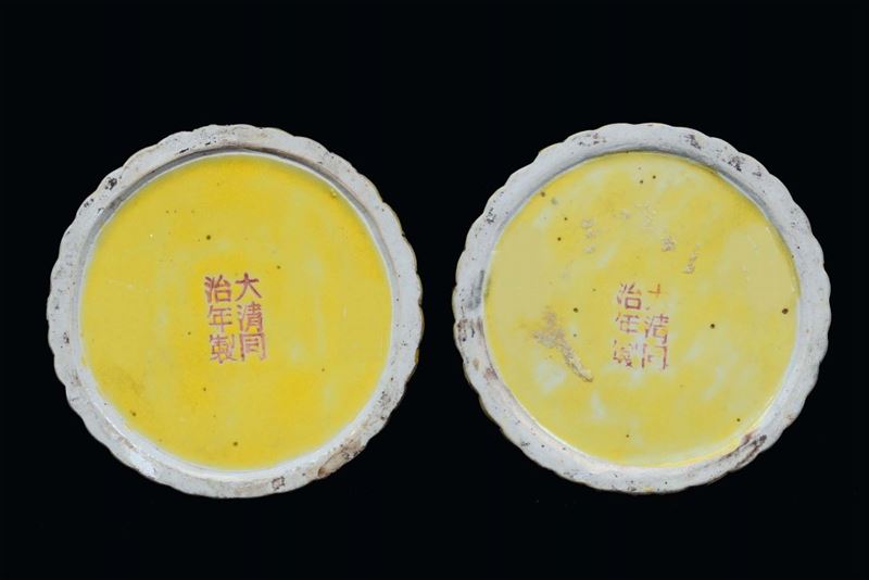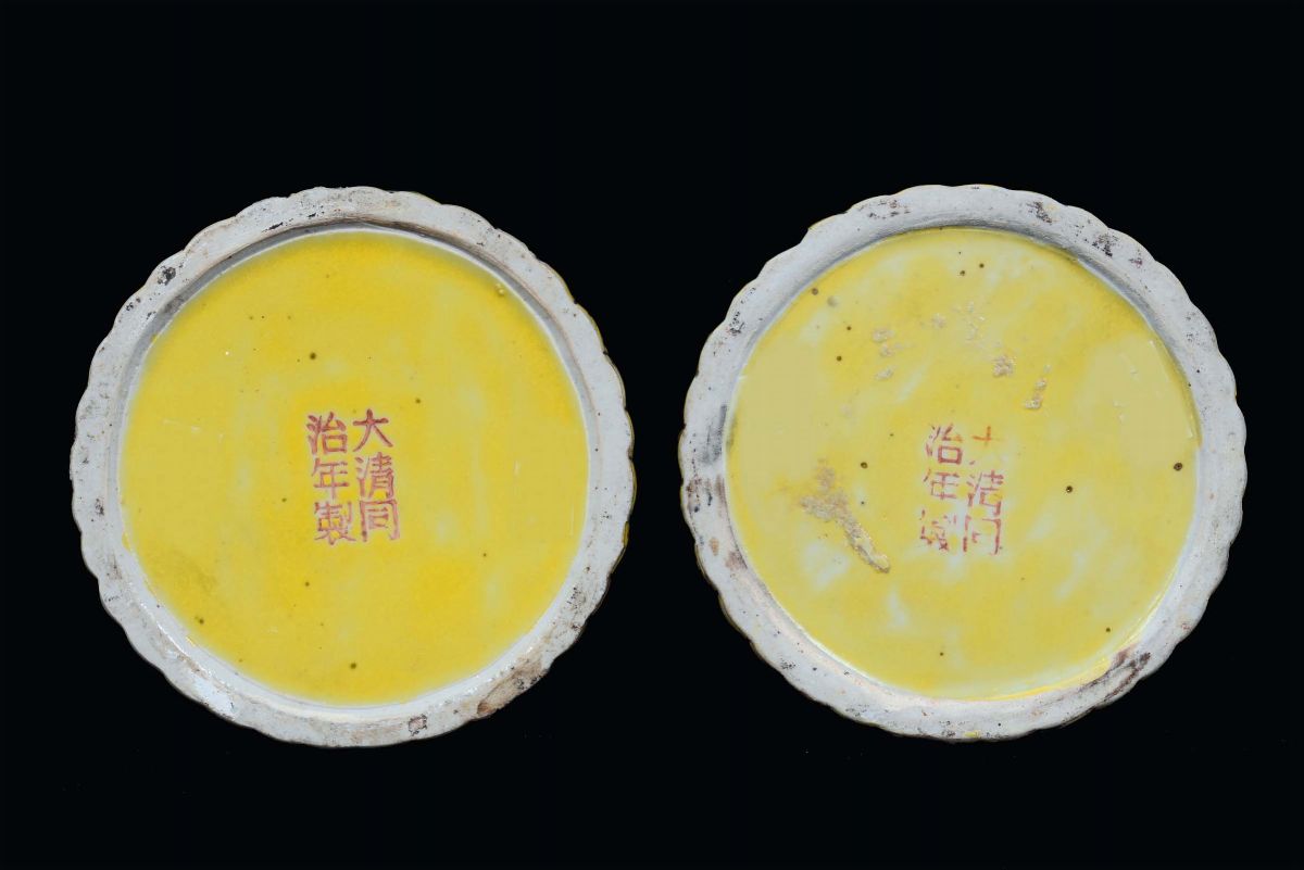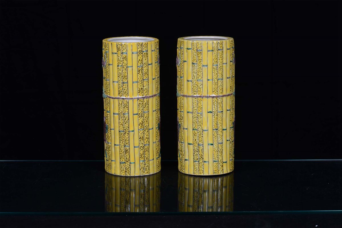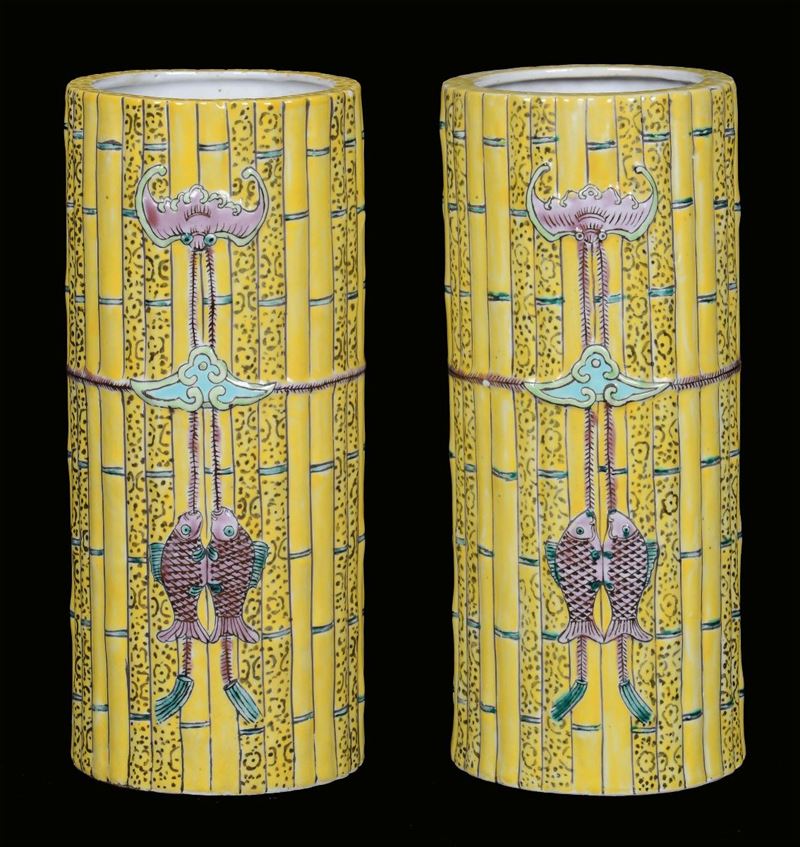 Coppia di vasi in porcellana sagomata a forma di bambù con rilievi di pesci e pipistrelli, Cina, marca e del periodo Guangxu [..]