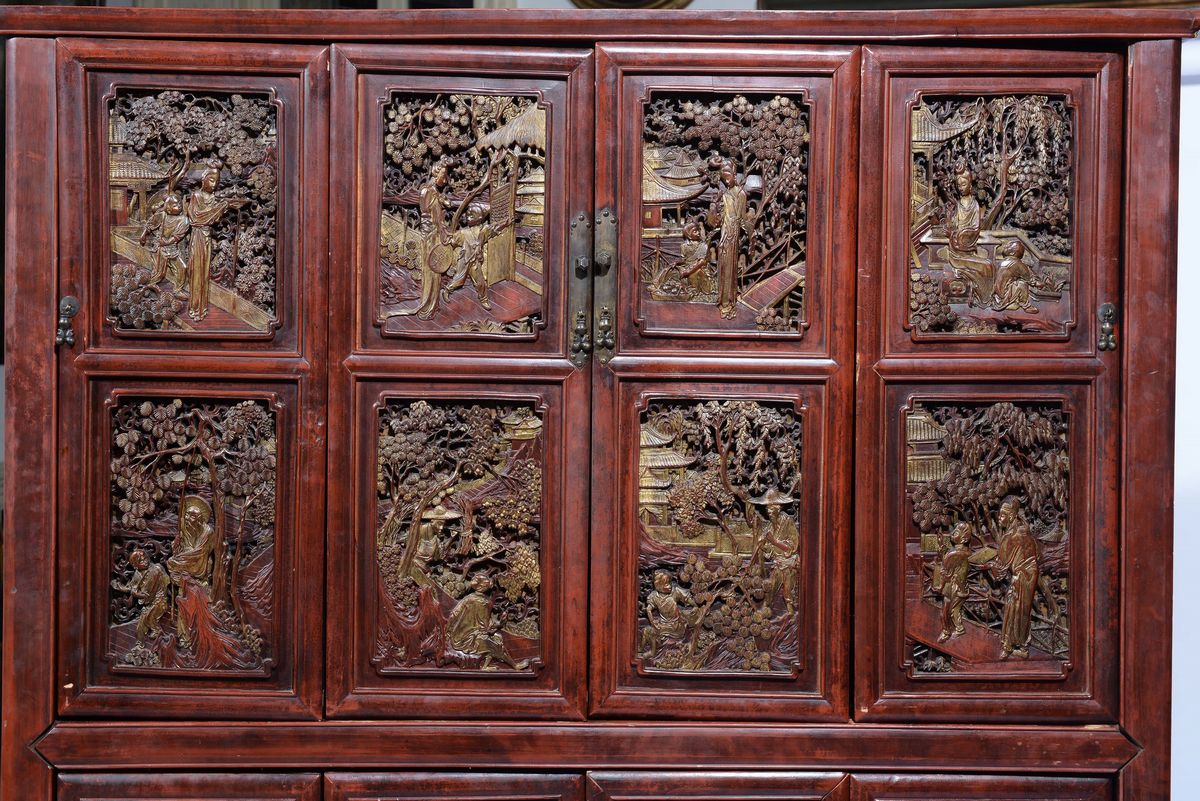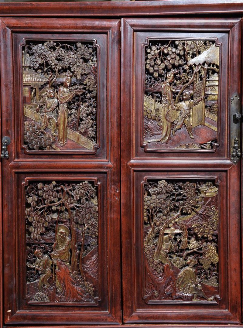 Credenza a quattro ante in legno scolpito con sedici formelle finemente intagliate, Cina XIX secolo