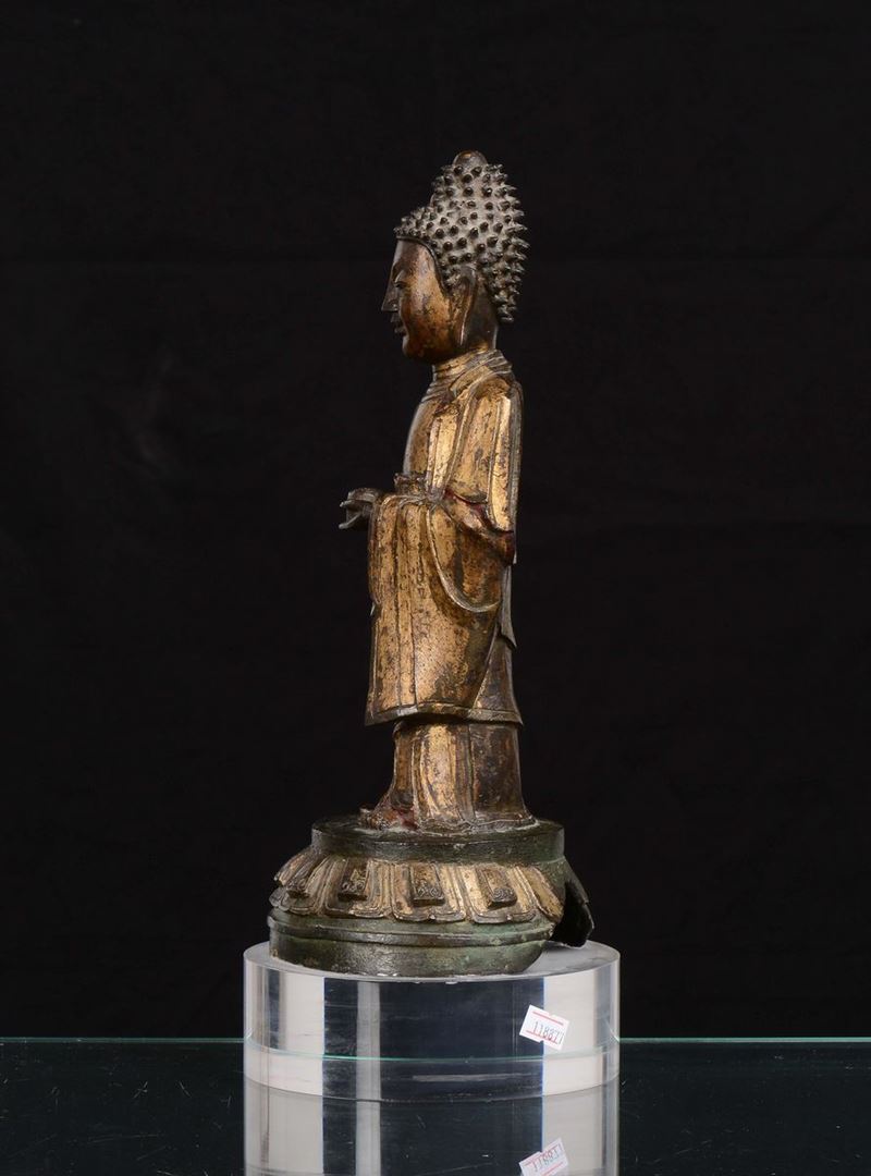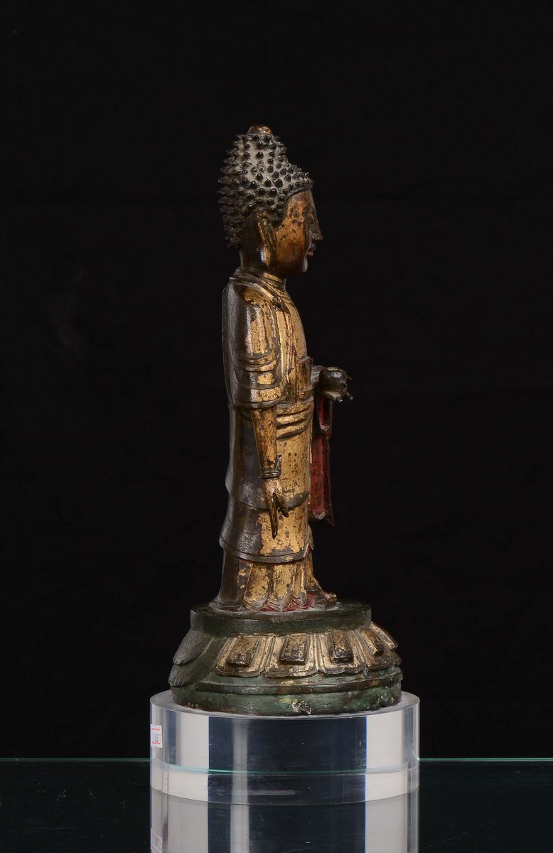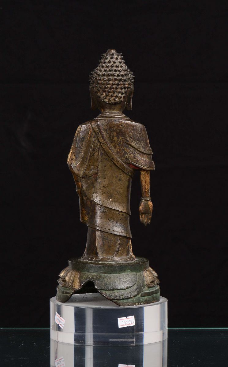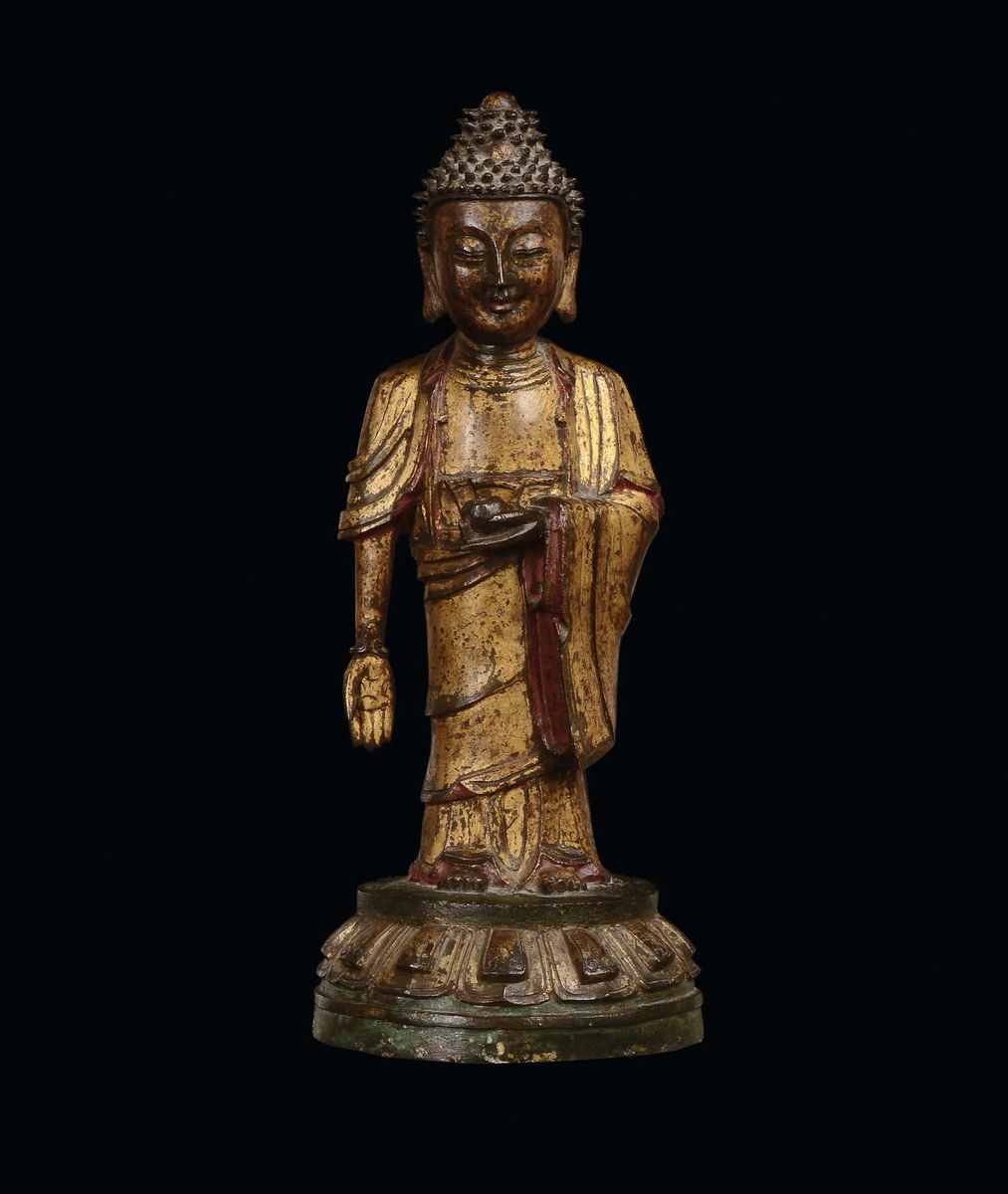 Figura di Buddha eretto in bronzo dorato, Cina Dinastia Ming, XVI secolo