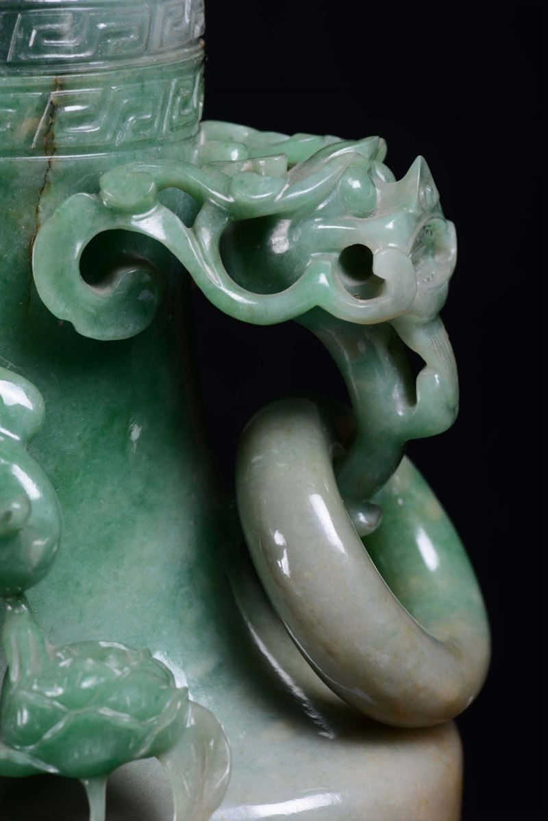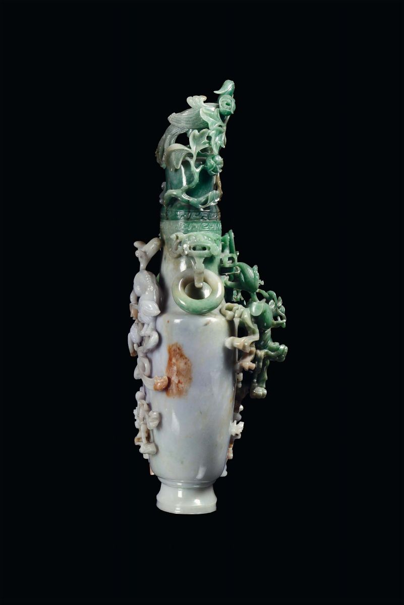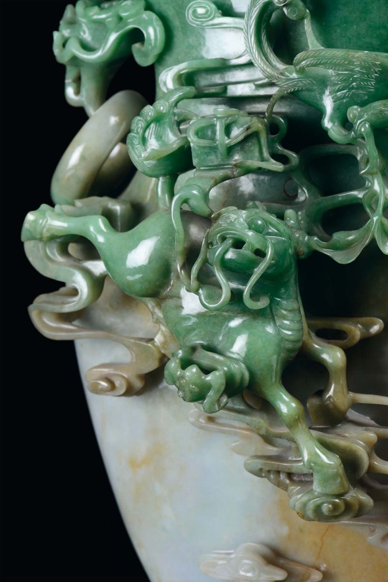 Grande ed importante vaso in giadeite color smeraldo e lavanda scolpito con figure zoomorfe in superficie, Cina, Dinastia Qing, fine XIX secolo