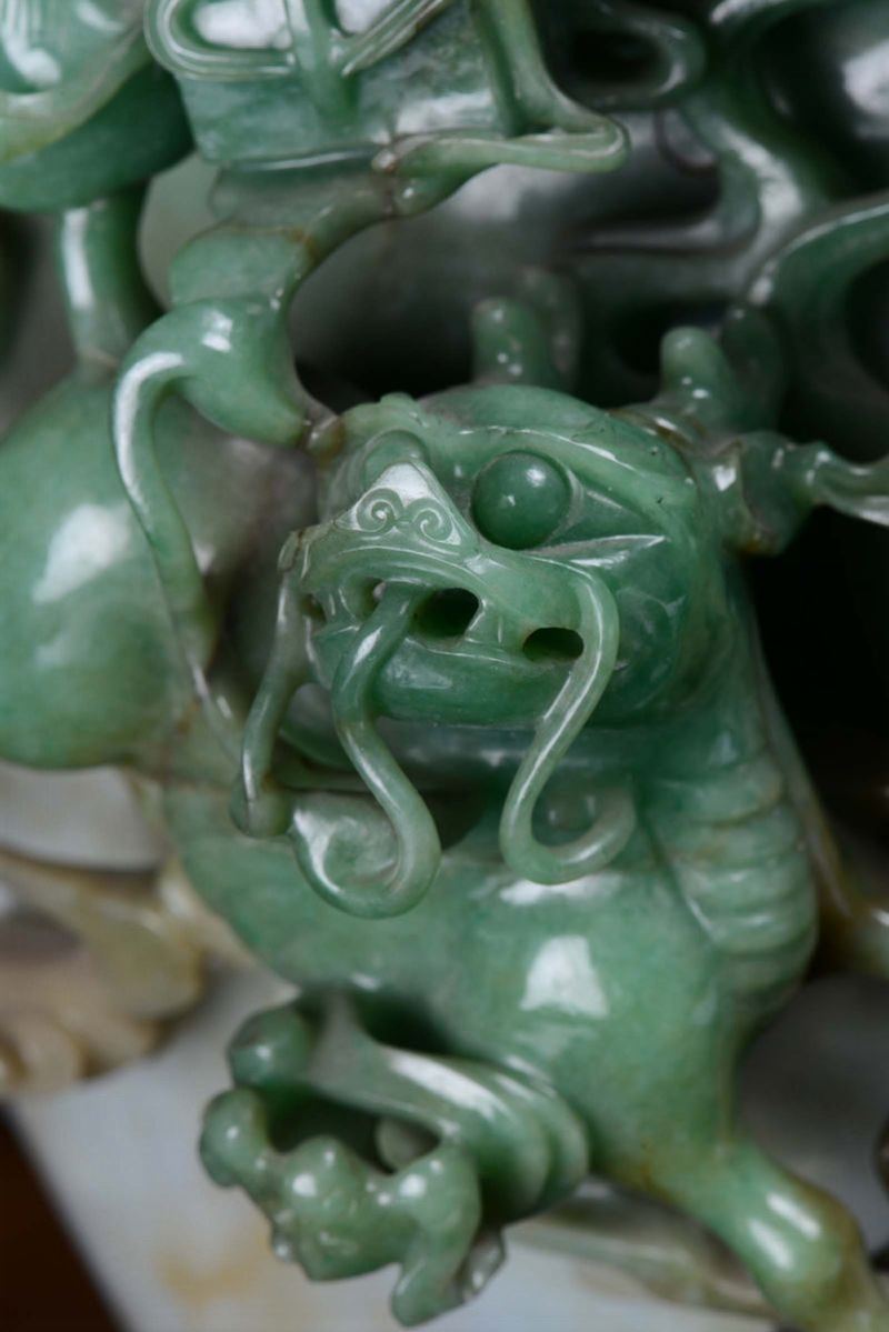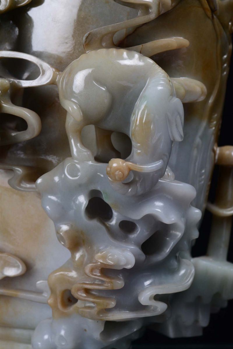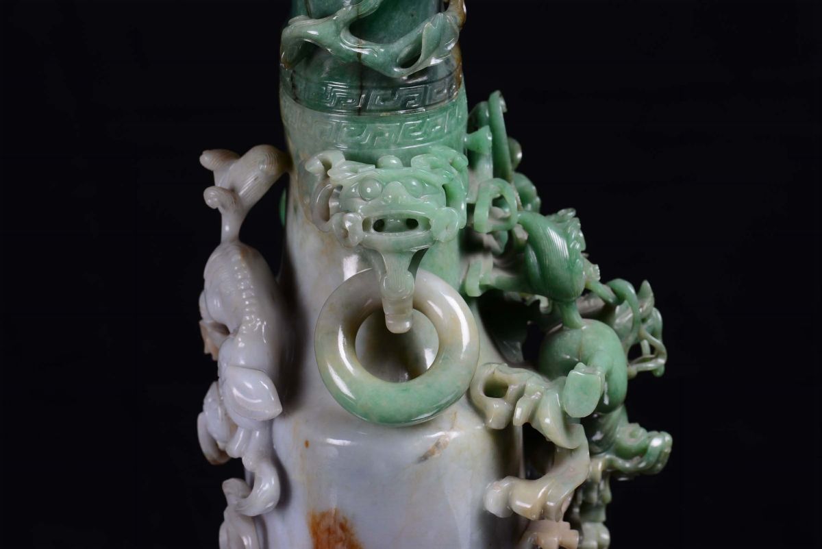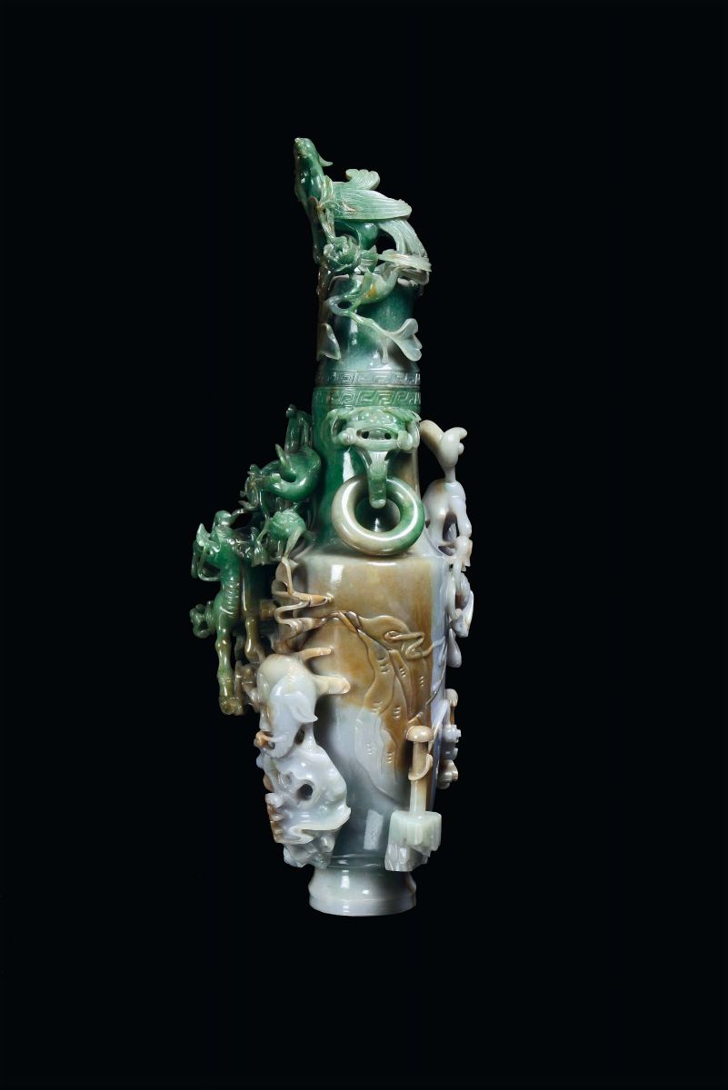 Grande ed importante vaso in giadeite color smeraldo e lavanda scolpito con figure zoomorfe in superficie, Cina, Dinastia Qing, fine XIX secolo