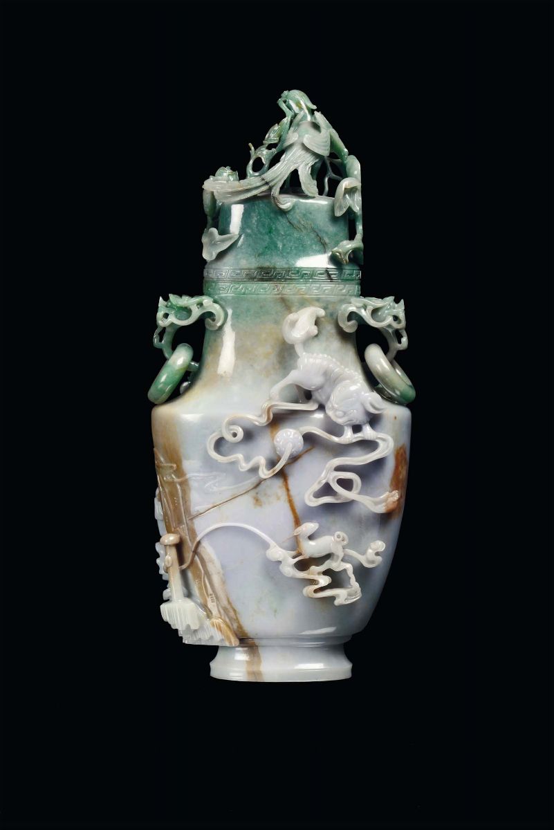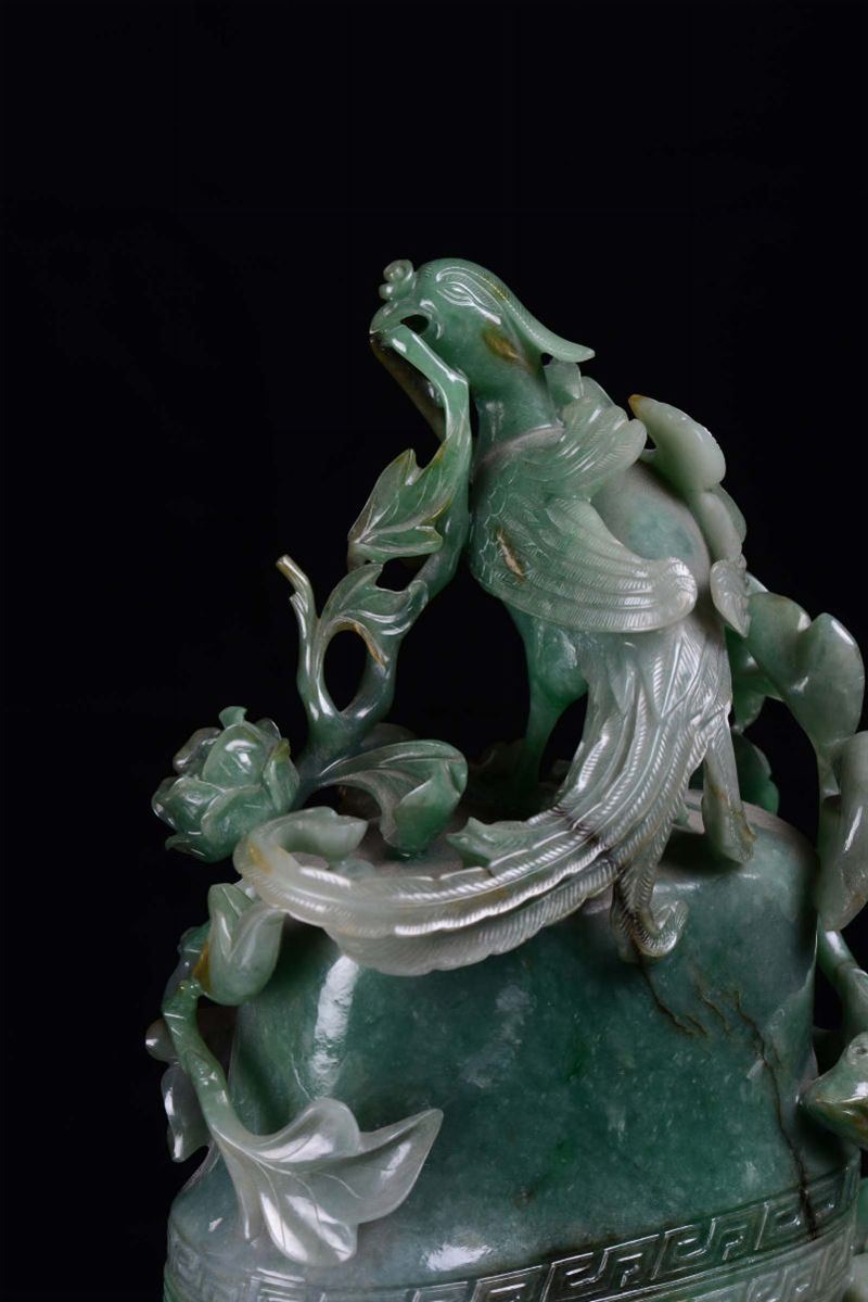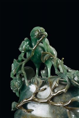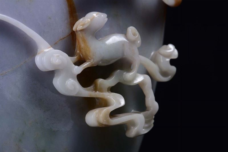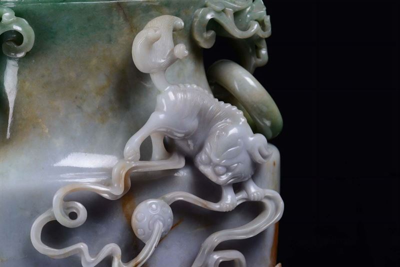 Grande ed importante vaso in giadeite color smeraldo e lavanda scolpito con figure zoomorfe in superficie, Cina, Dinastia [..]