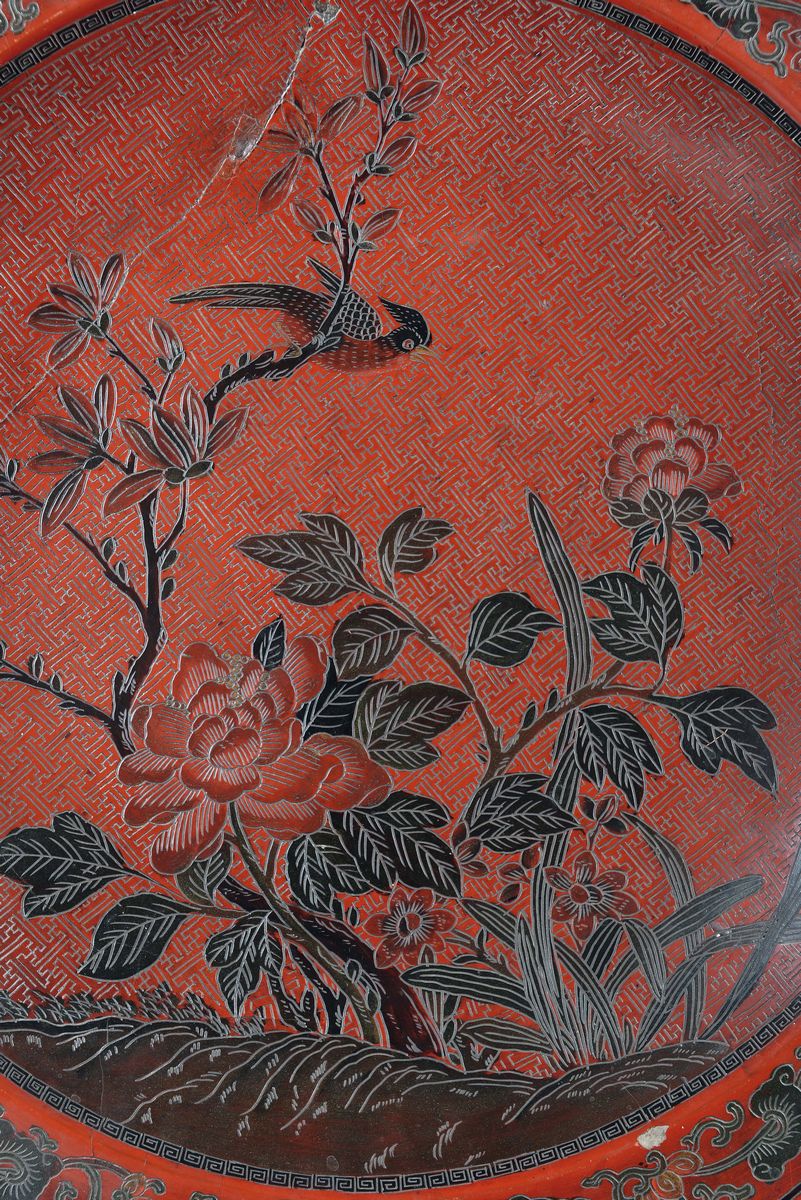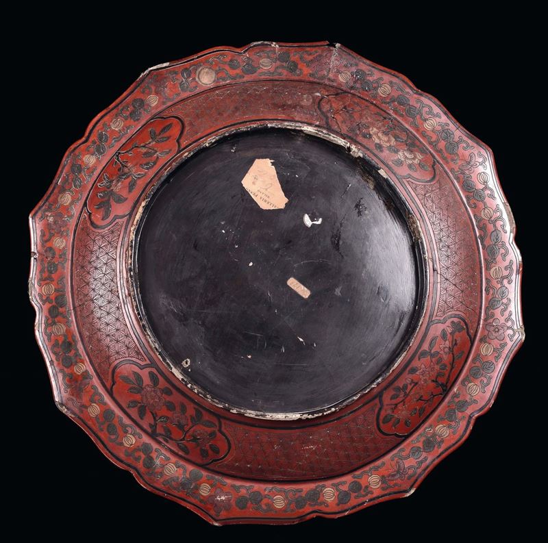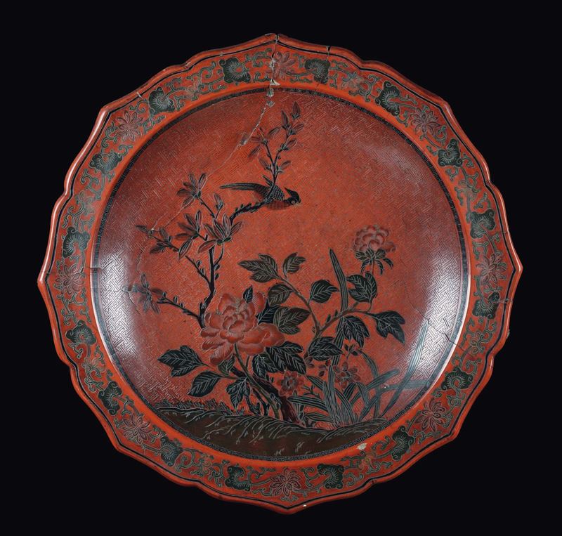 Grande piatto in lacca rossa incisa, Cina, Dinastia Ming, Periodo Jiajing (1522-1566)