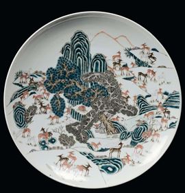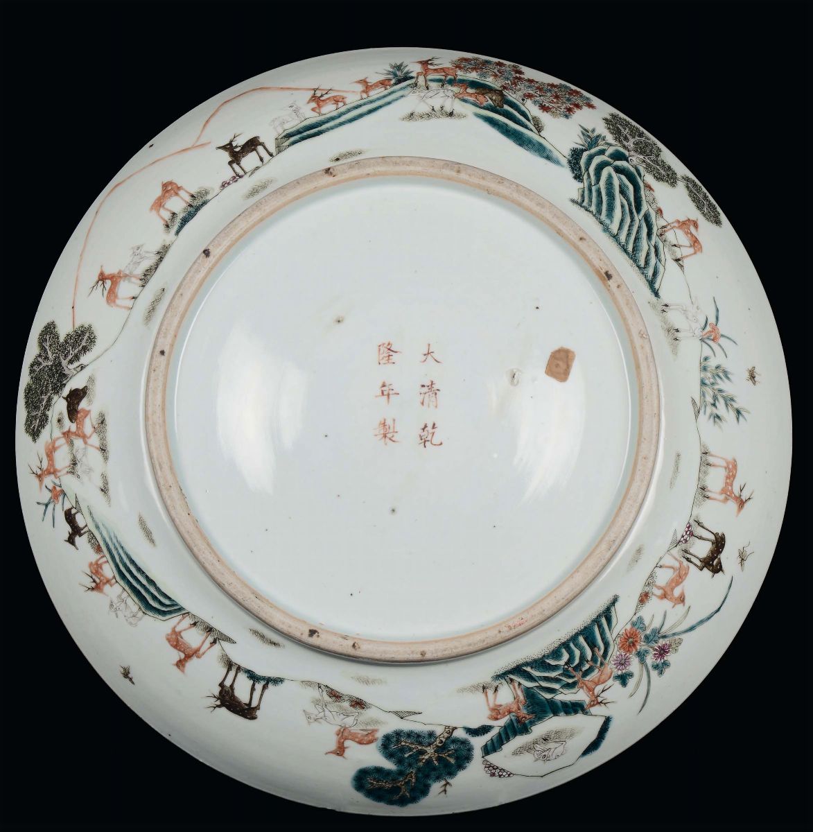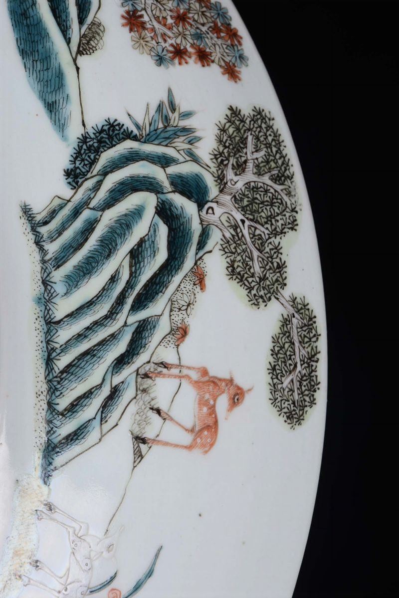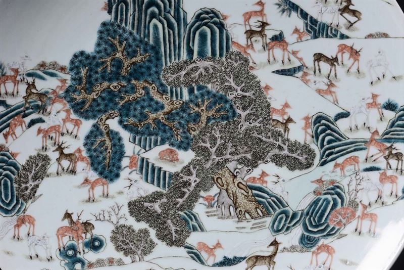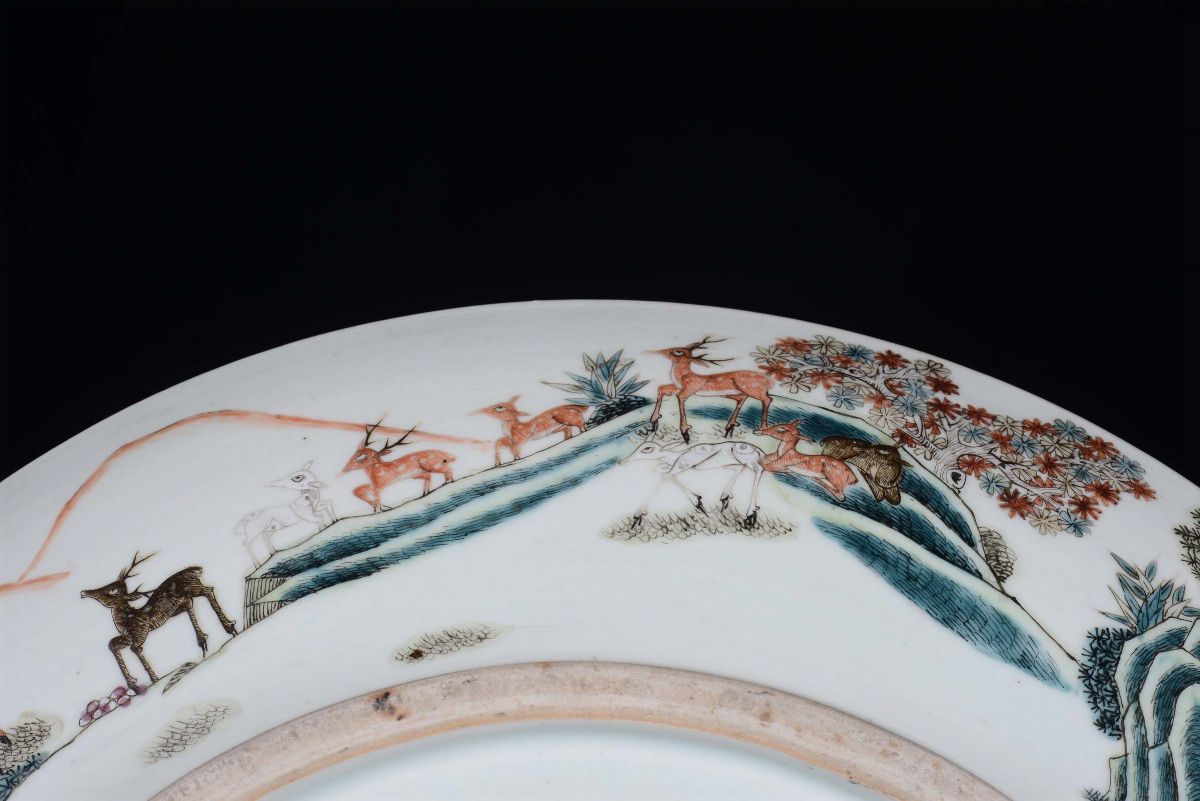 Grande piatto in porcellana Cento cervi con i colori della Famiglia Verde, Cina, Dinastia Qing, Periodo Guangxu ( 1875-1908)