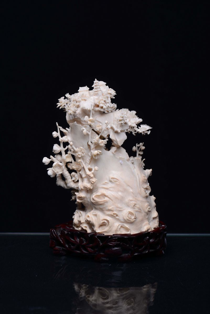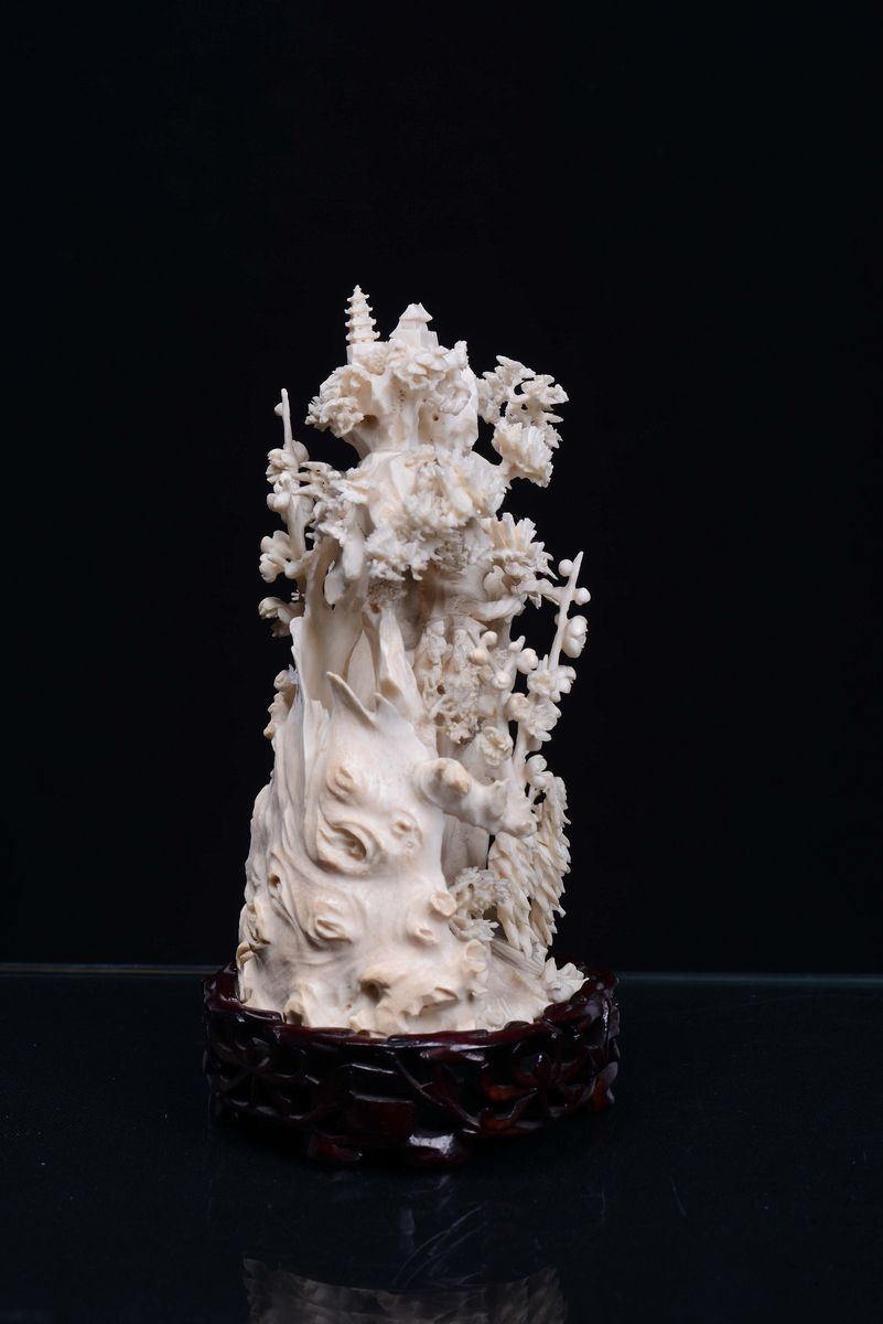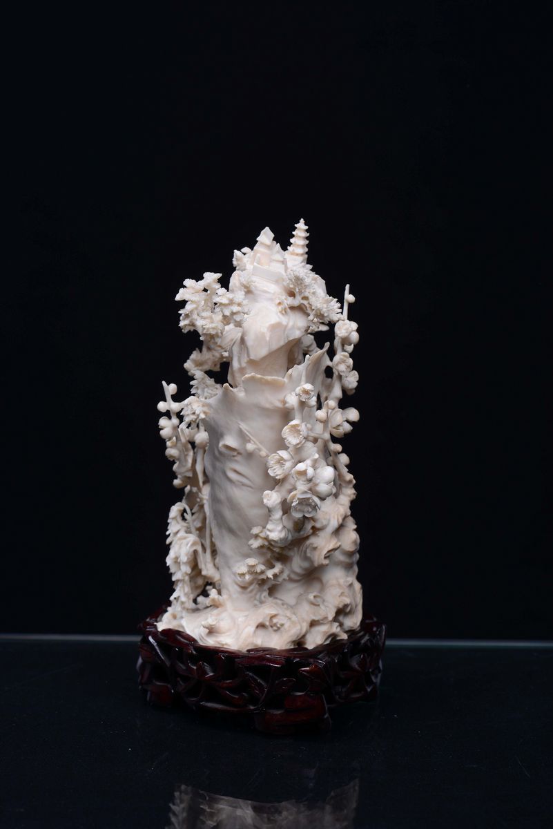 Gruppo in avorio finemente intagliato e lavorato raffigurante albero con templi e figura orientale, Cina XX secolo