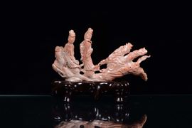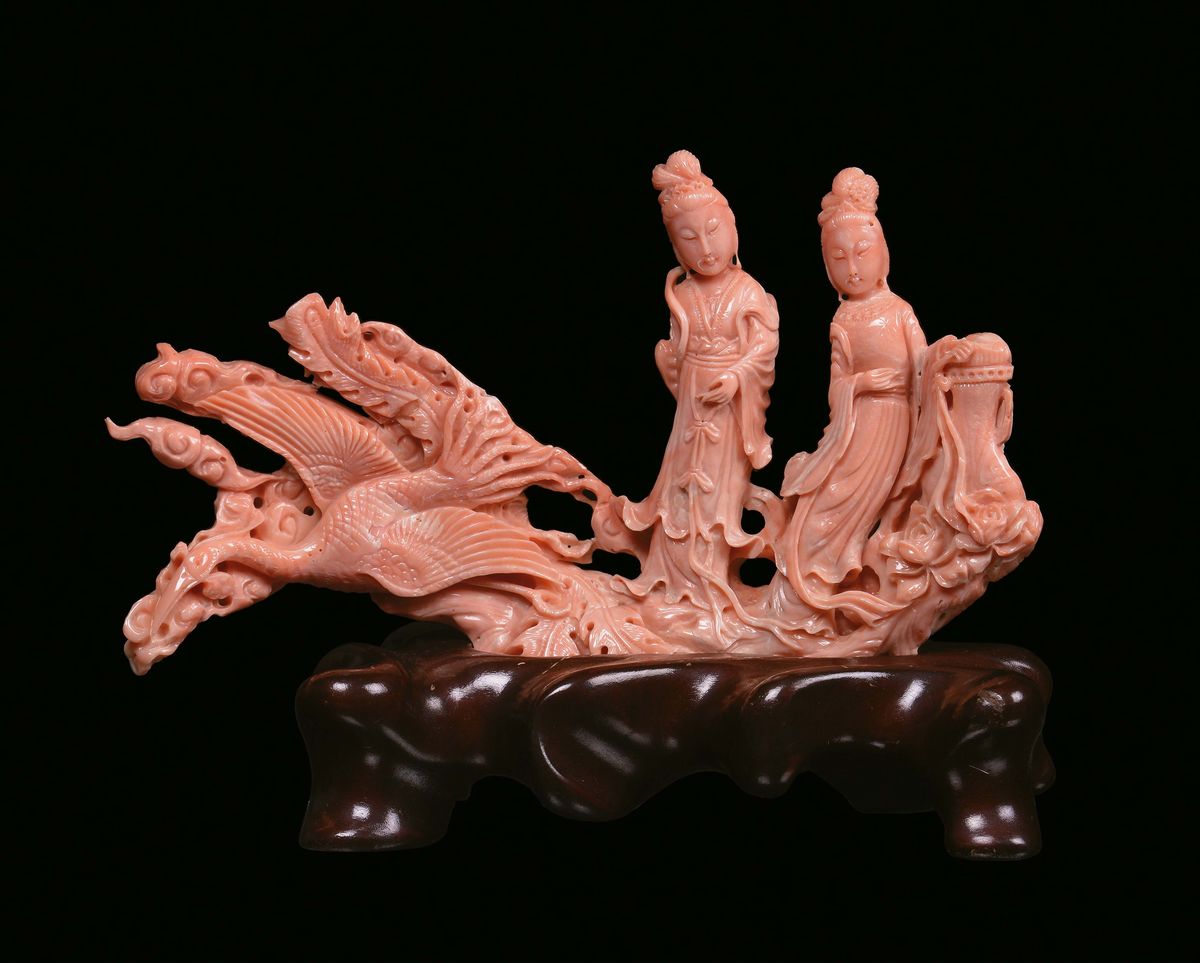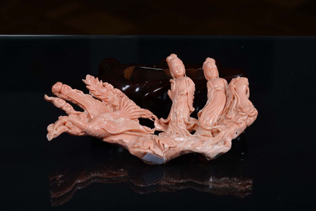Gruppo in corallo rosa con figure, Cina inizio XX secolo