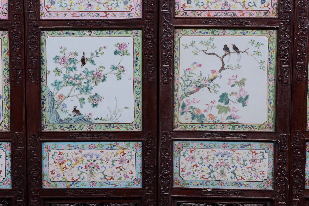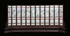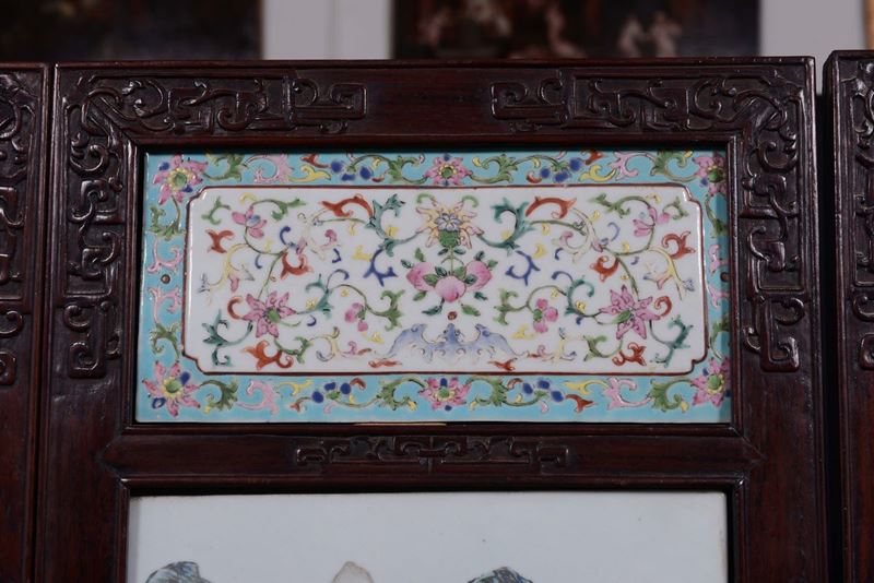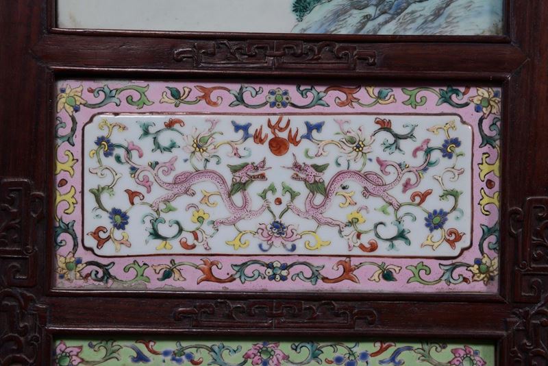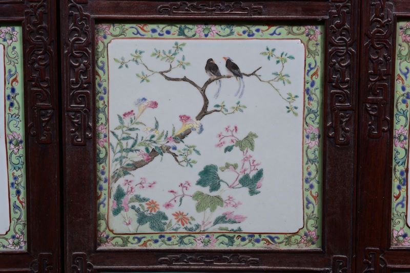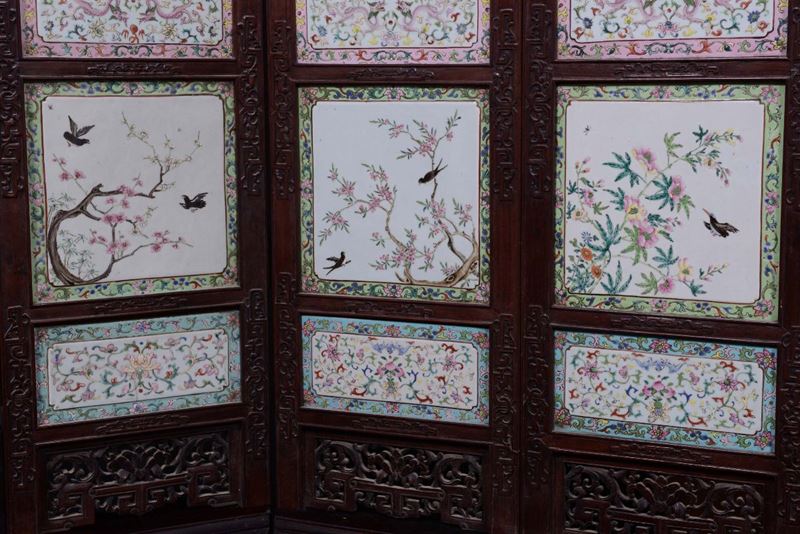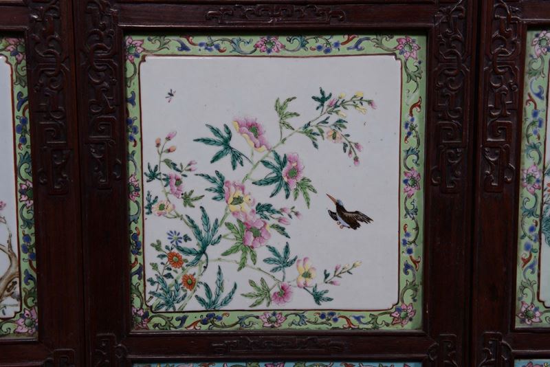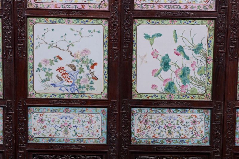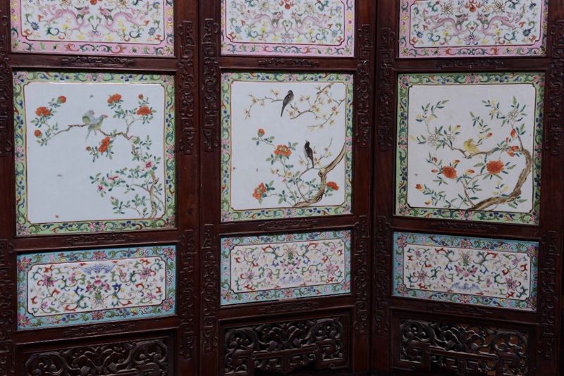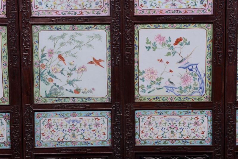 Importante paravento a dodici ante in legno di Homu e sessantaquattro placche in porcellana policroma, Cina, Dinastia Qing, Epoca Jiaqing (1796-1820)