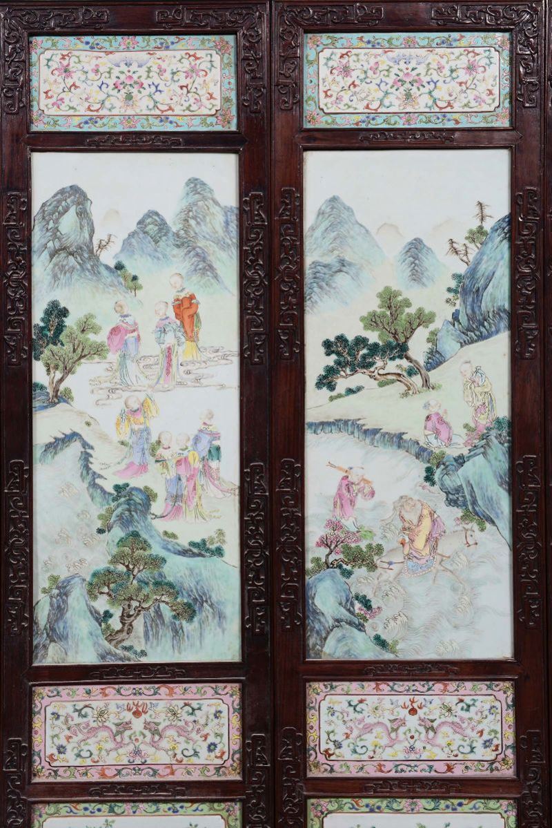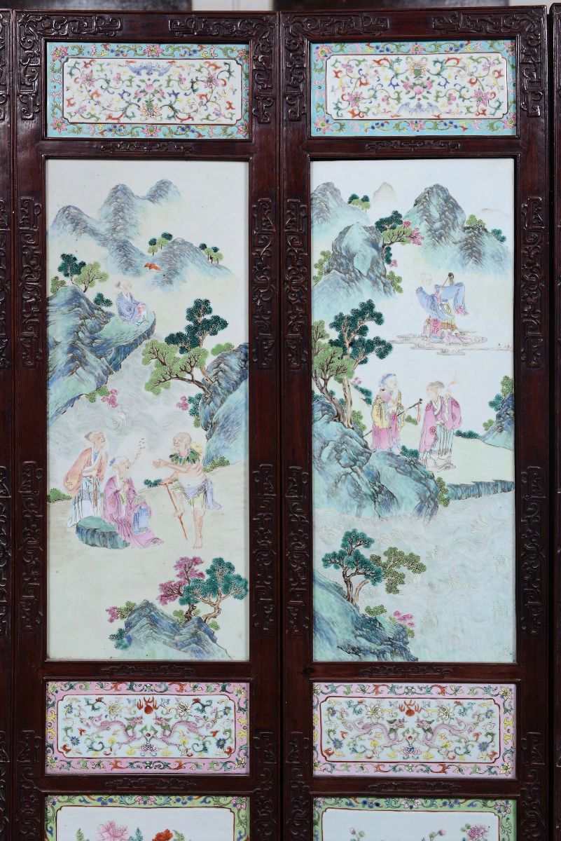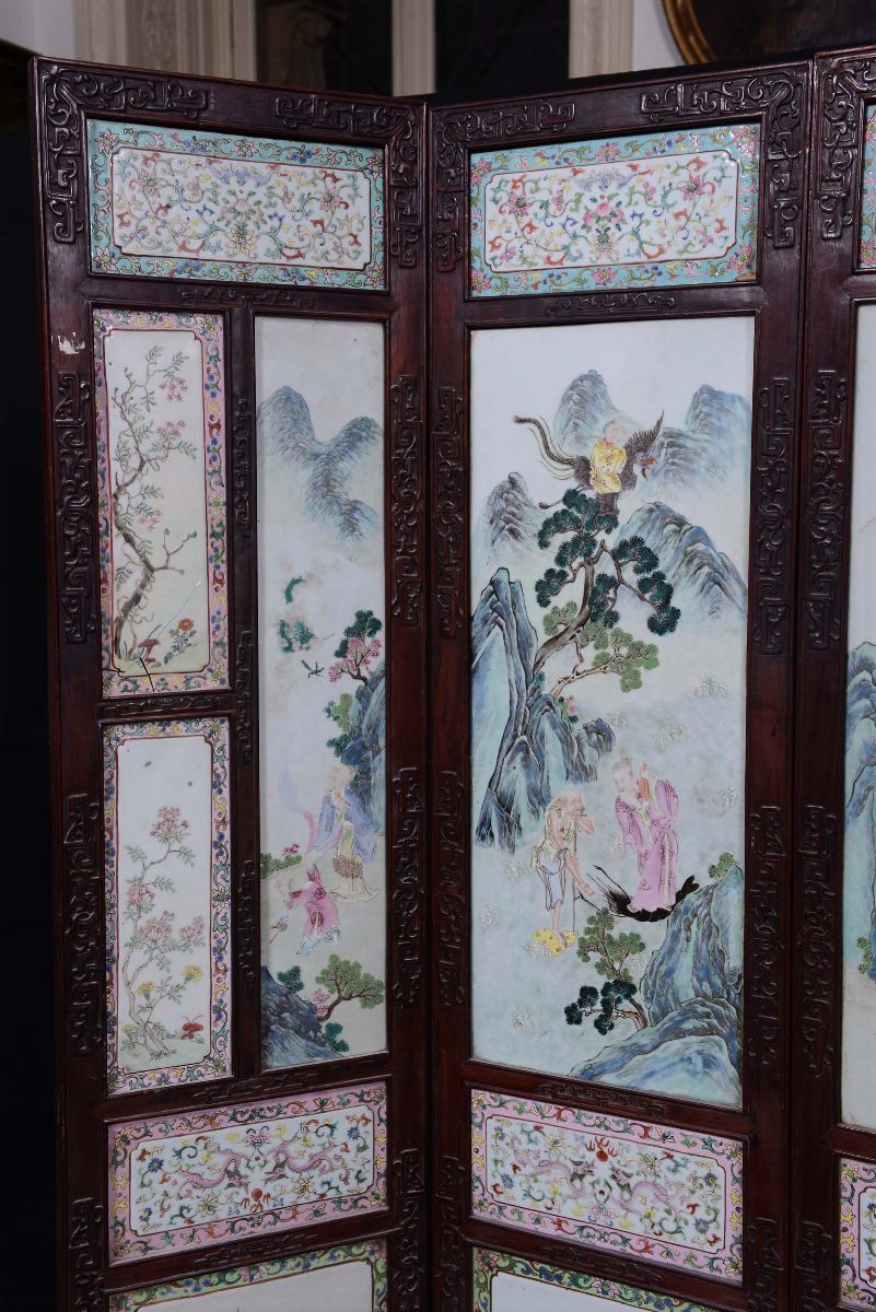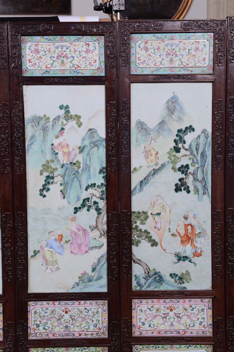 Importante paravento a dodici ante in legno di Homu e sessantaquattro placche in porcellana policroma, Cina, Dinastia Qing, Epoca Jiaqing (1796-1820)