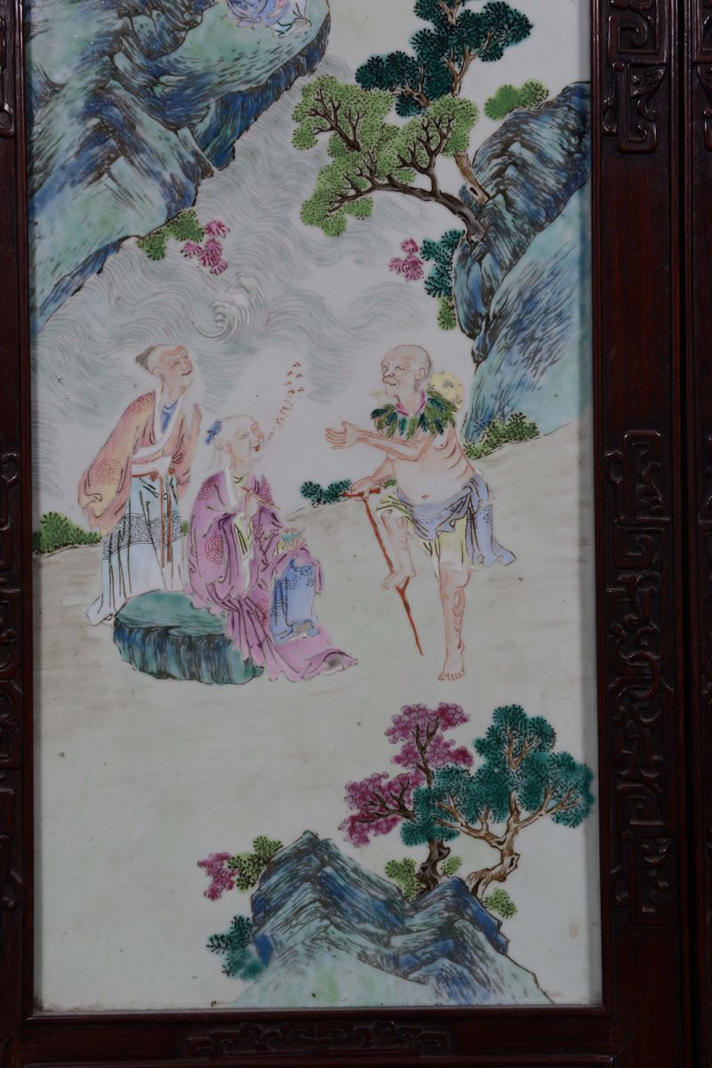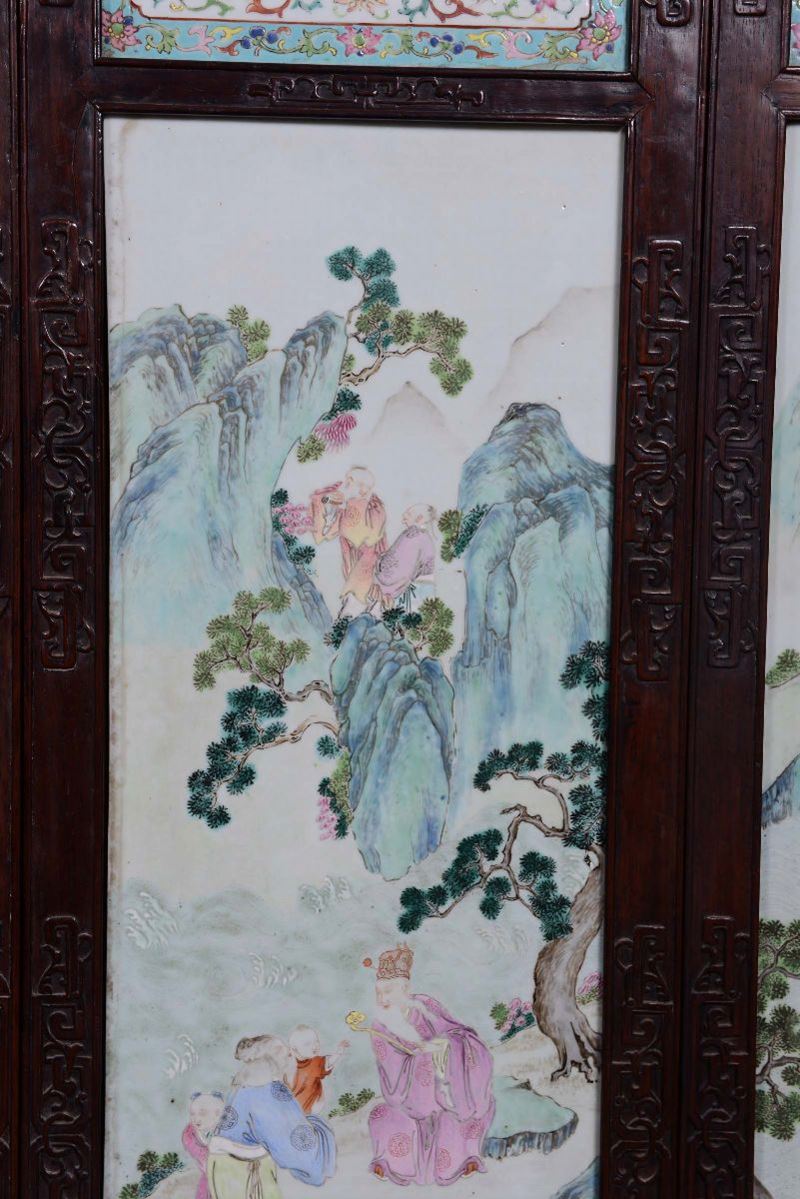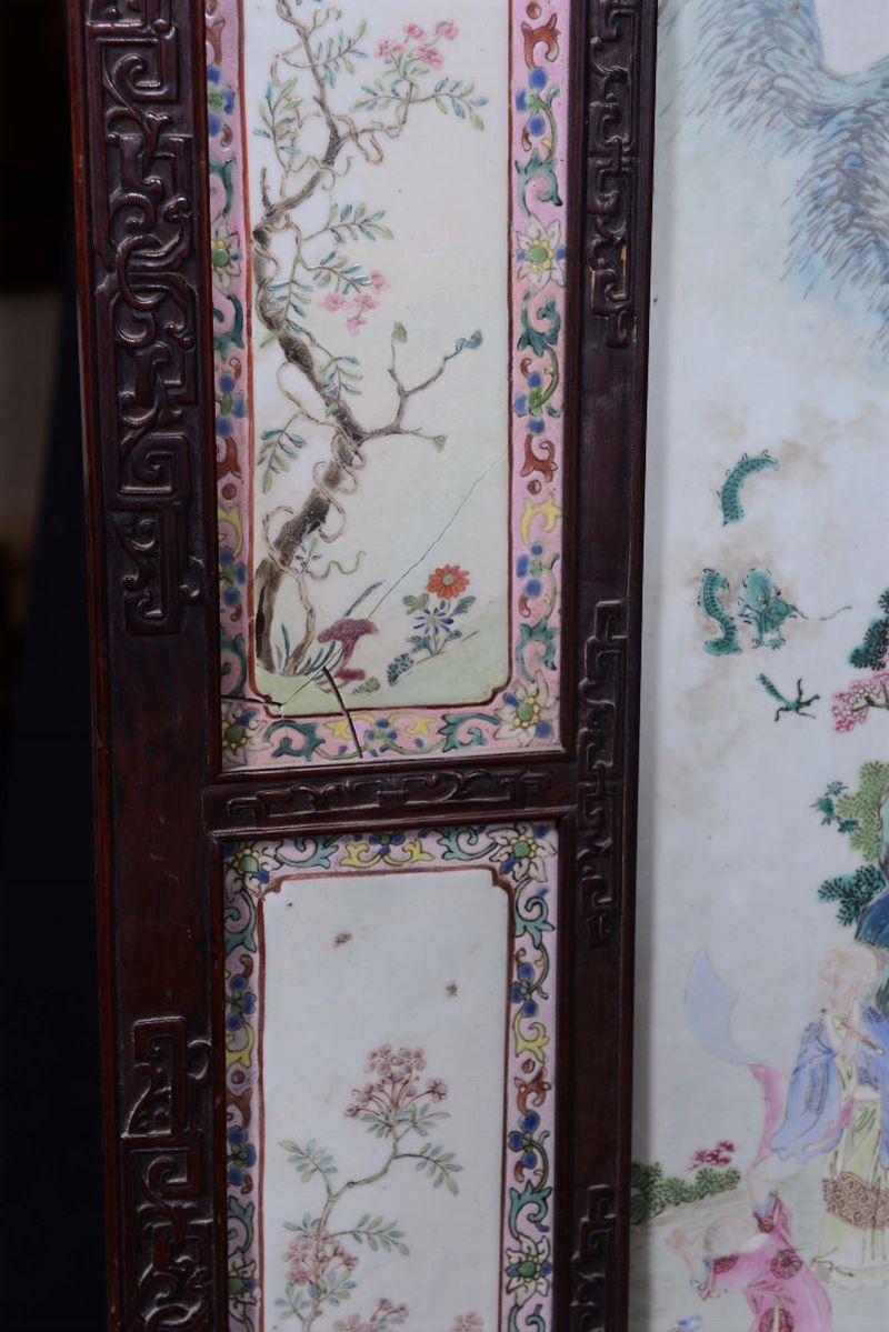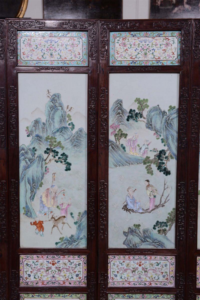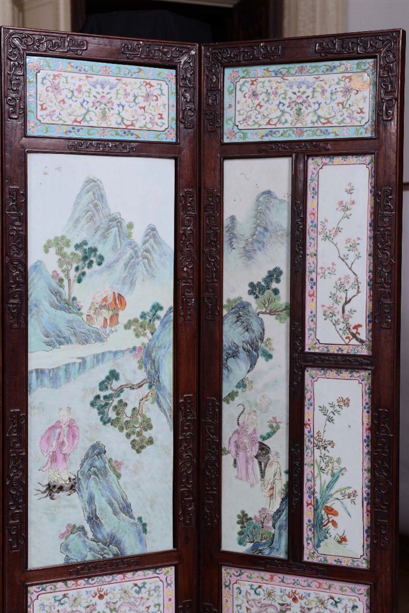 Importante paravento a dodici ante in legno di Homu e sessantaquattro placche in porcellana policroma, Cina, Dinastia Qing, Epoca Jiaqing (1796-1820)