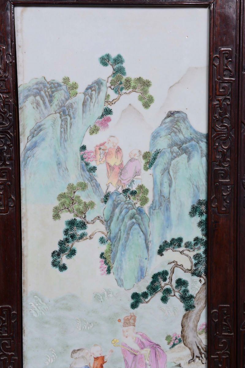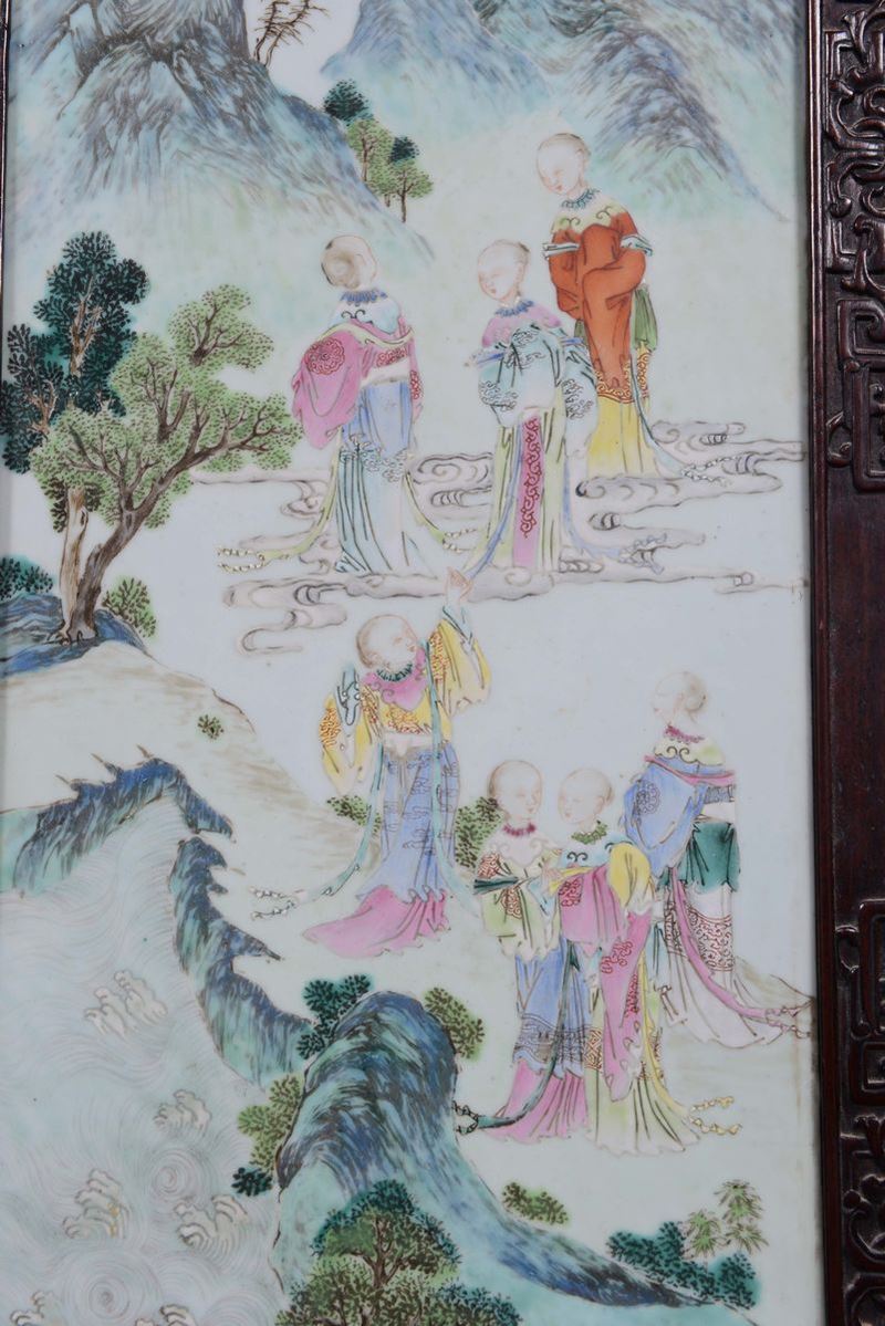 le placche sono decorate a motivi floreali e paesaggi con figure nei colori della Famiglia Rosa, cm 395X53X175