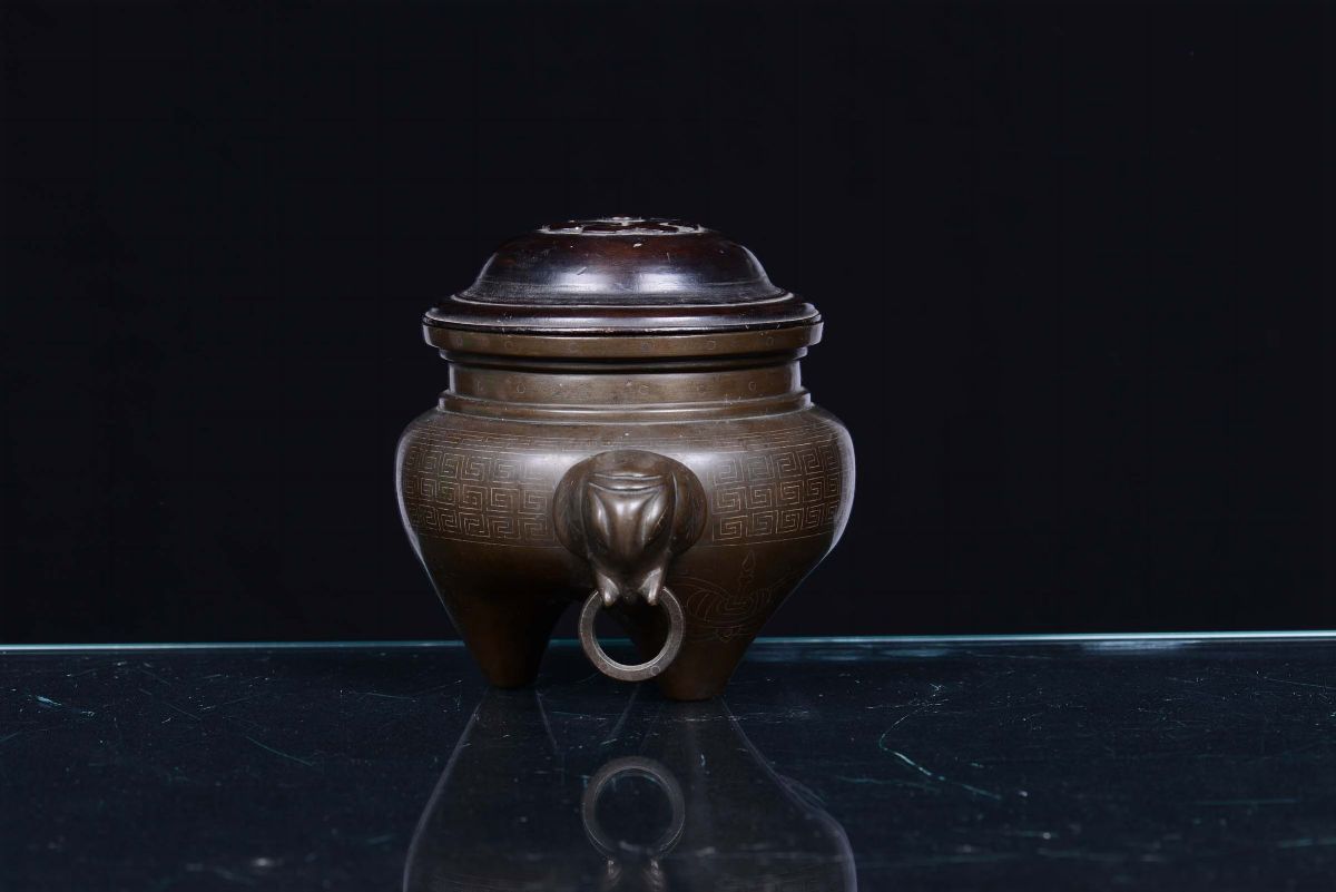 Incensiere in bronzo con coperchio in legno e manici a testa di elefante, Cina, Dinastia Qing, XVIII secolo