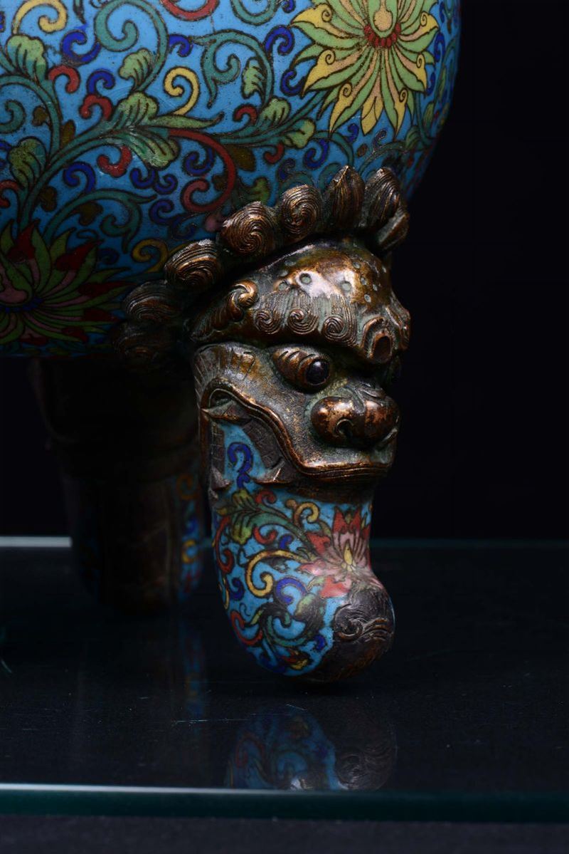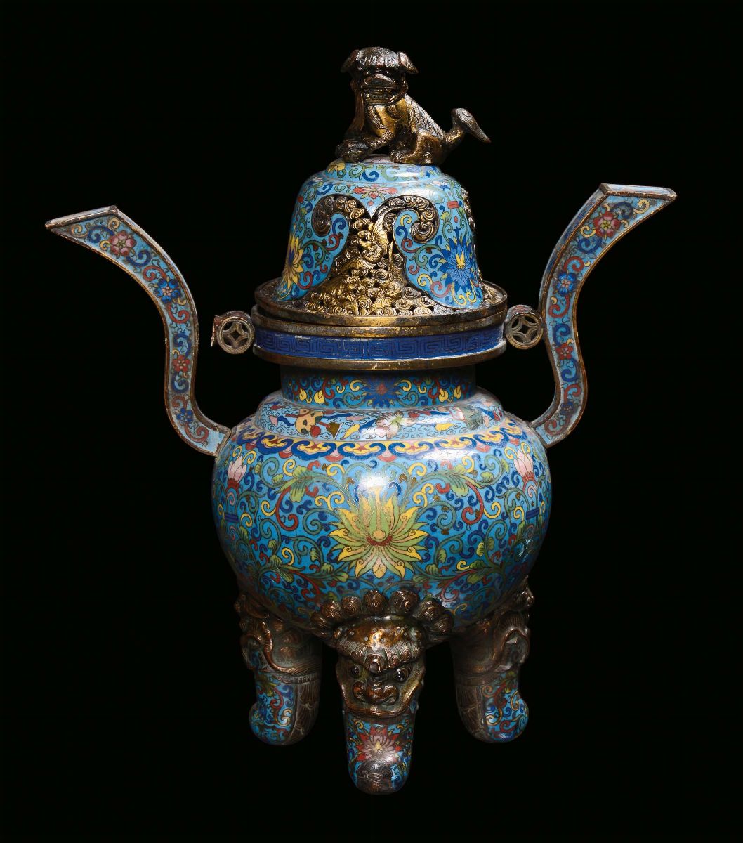 corpo ovoidale poggiante su tre piedi con teste di elefanti, decoro a motivo vegetale stilizzato su fondo azzurro, cane di Pho in bronzo dorato sul coperchio, h cm 41,5