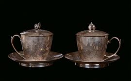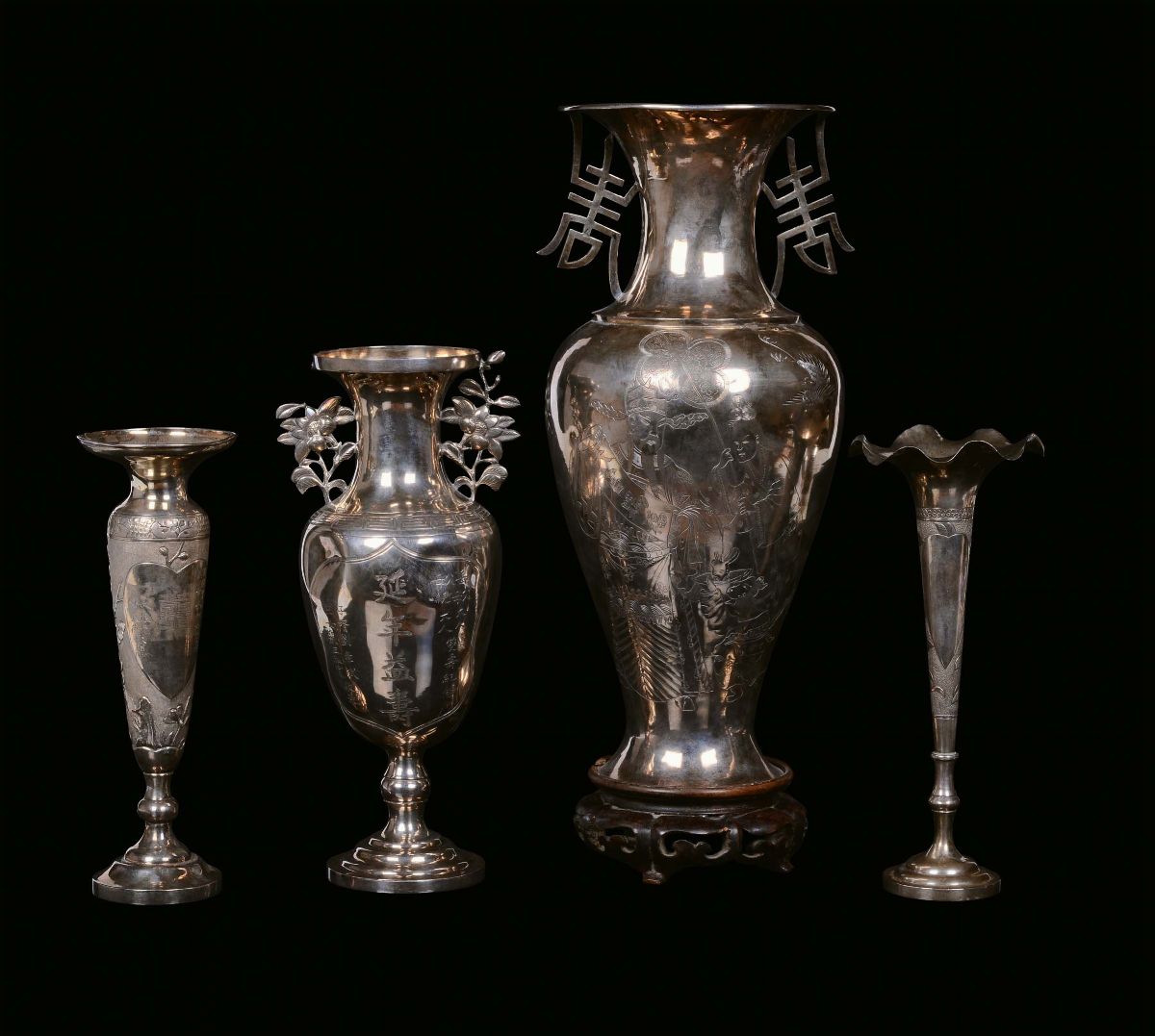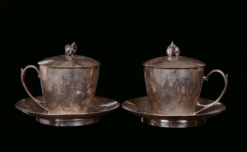 Lotto composto da quattro vasi e due tazzine con piattino in argento inciso a motivi naturalistici, Cina,Dinastia Qing, XIX secolo