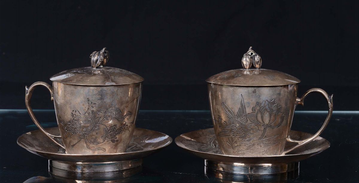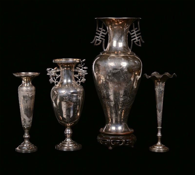Lotto composto da quattro vasi e due tazzine con piattino in argento inciso a motivi naturalistici, Cina,Dinastia Qing, [..]