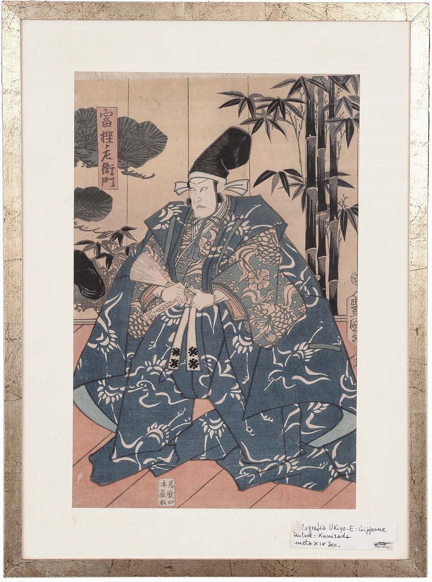 Lotto composto Gheisha Ukiyo by Utagawa Kunisada e un Samurai Ukiyo by Utagawa Kunisada, Giappone, XIX secolo