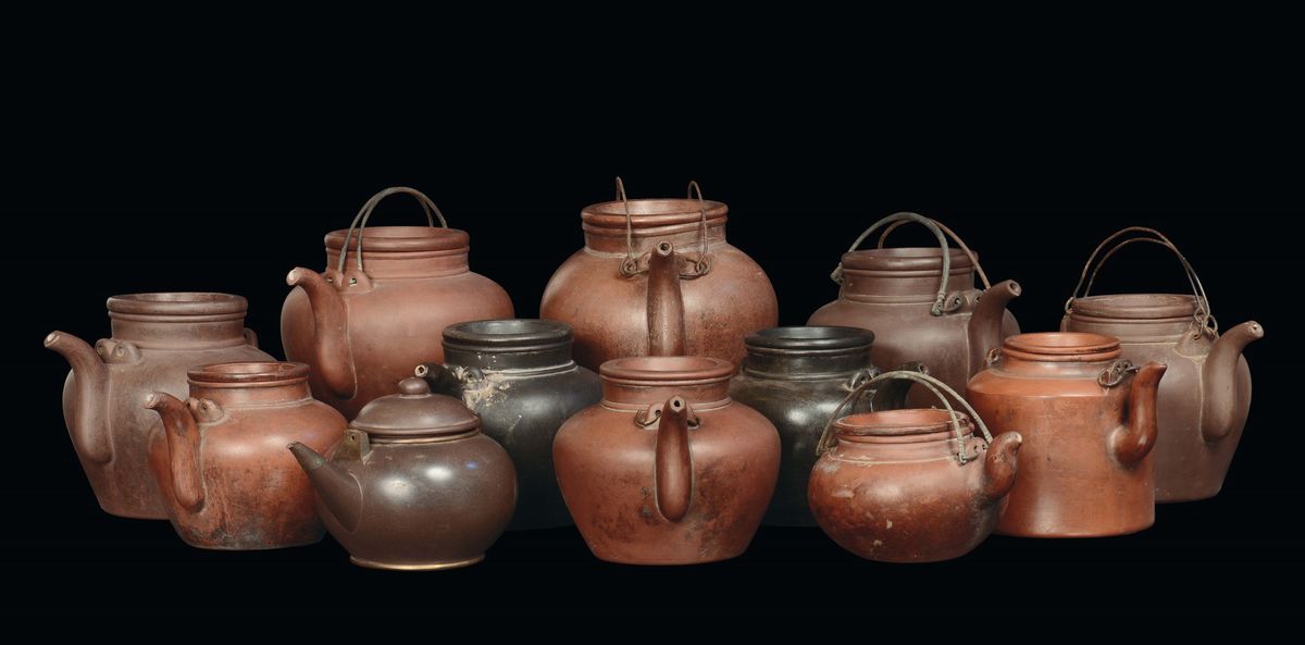 Lotto di dodici teiere in grès Yixing di vari colori e misure, Cina, Dinastia Qing, XIX secolo