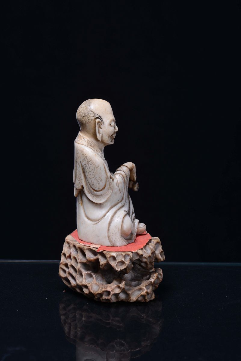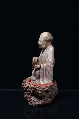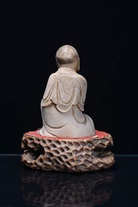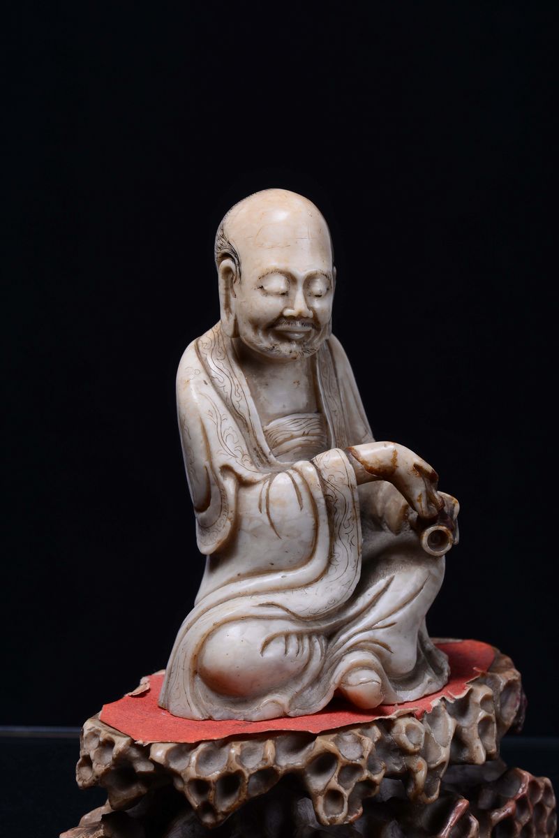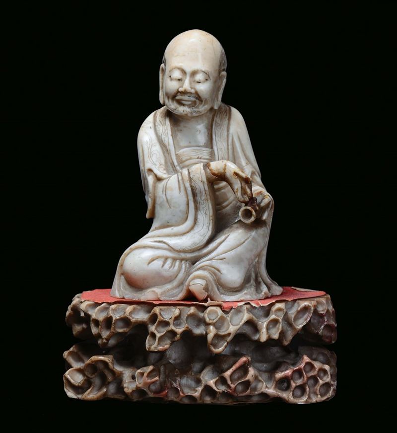 Luohan in pietra saponaria su base a forma di roccia, Cina, Dinastia Qing, XVIII secolo